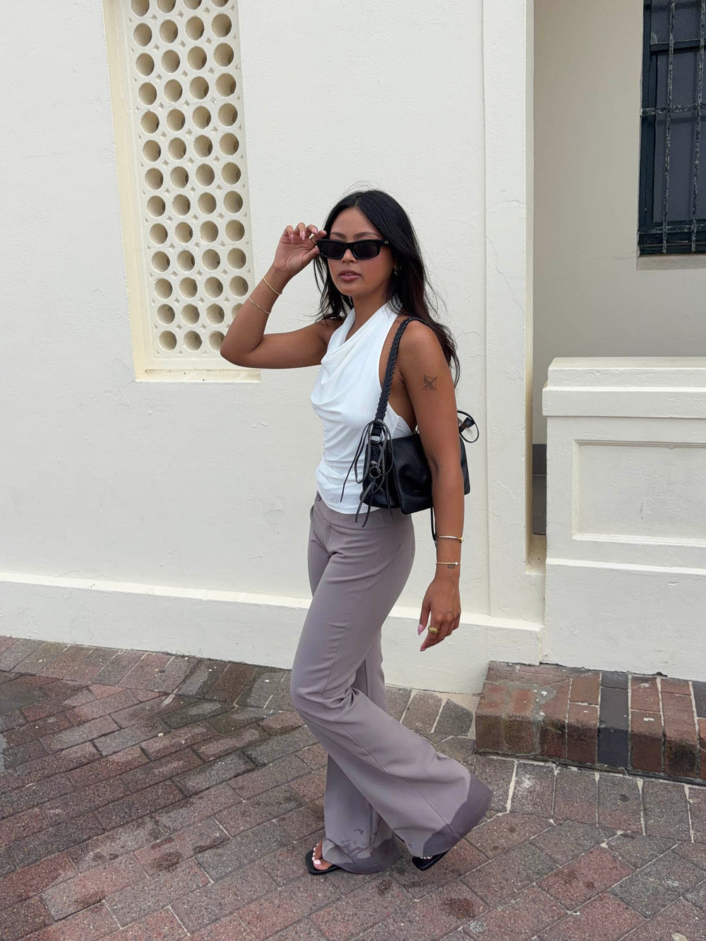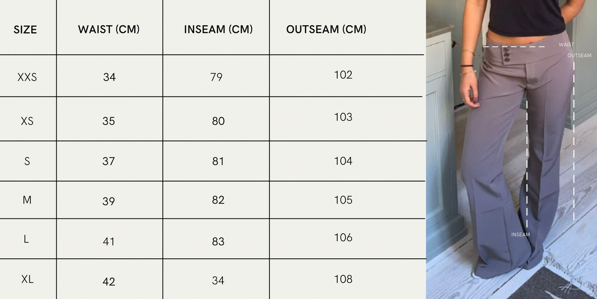 Disse bukser har en moderne lav talje og lukkes med knapper og lynlås foran. De er designet med en flared og løs pasform, der sikrer både komfort og et stilfuldt udtryk. Det enkle design gør dem nemme at style til både hverdag og mere formelle anledninger.