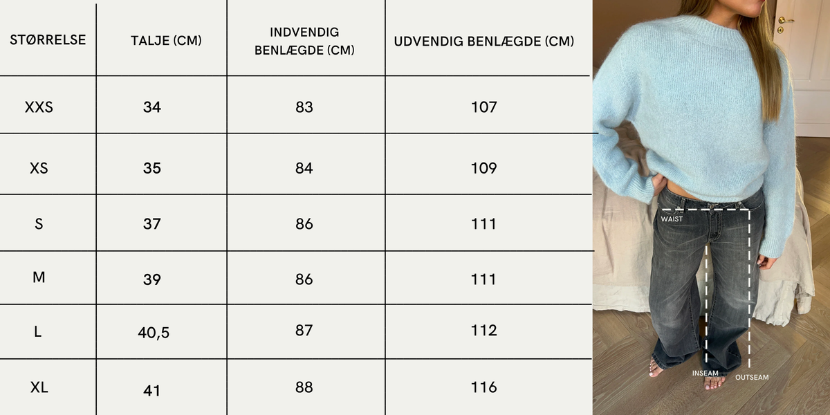 OBS: Størrelsen på denne model kan variere afhængigt af den vask, produktet har gennemgået under produktionen.