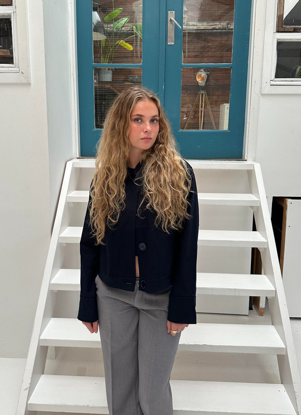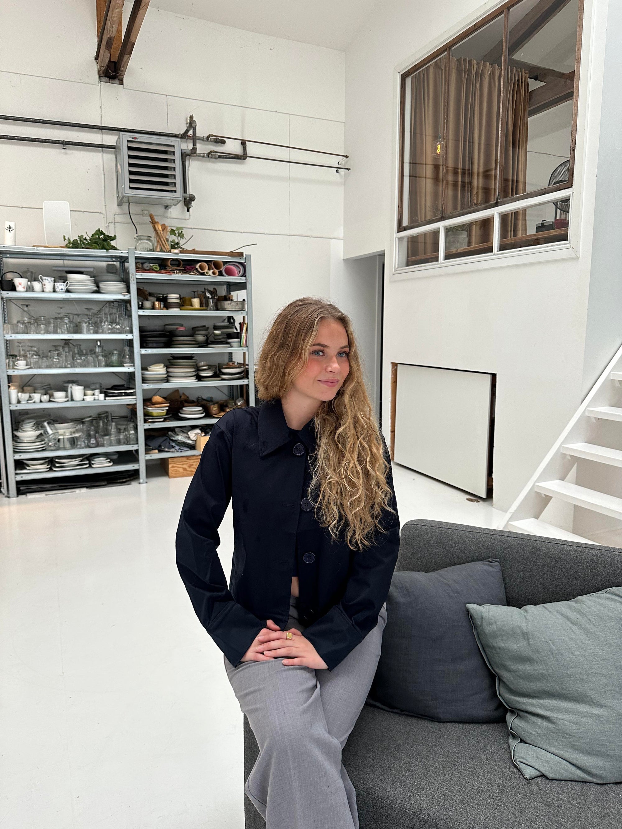 Denne trenchcoat har en kort pasform og lukkes med 4 knapper, som er navy-farvet. Denne trenchcoat består af en klassisk krave og har skrå lommer i siderne.