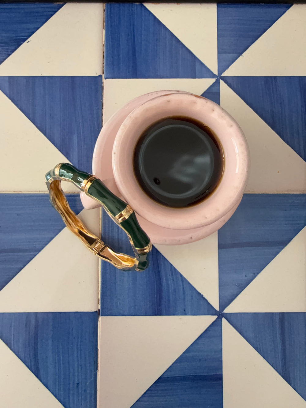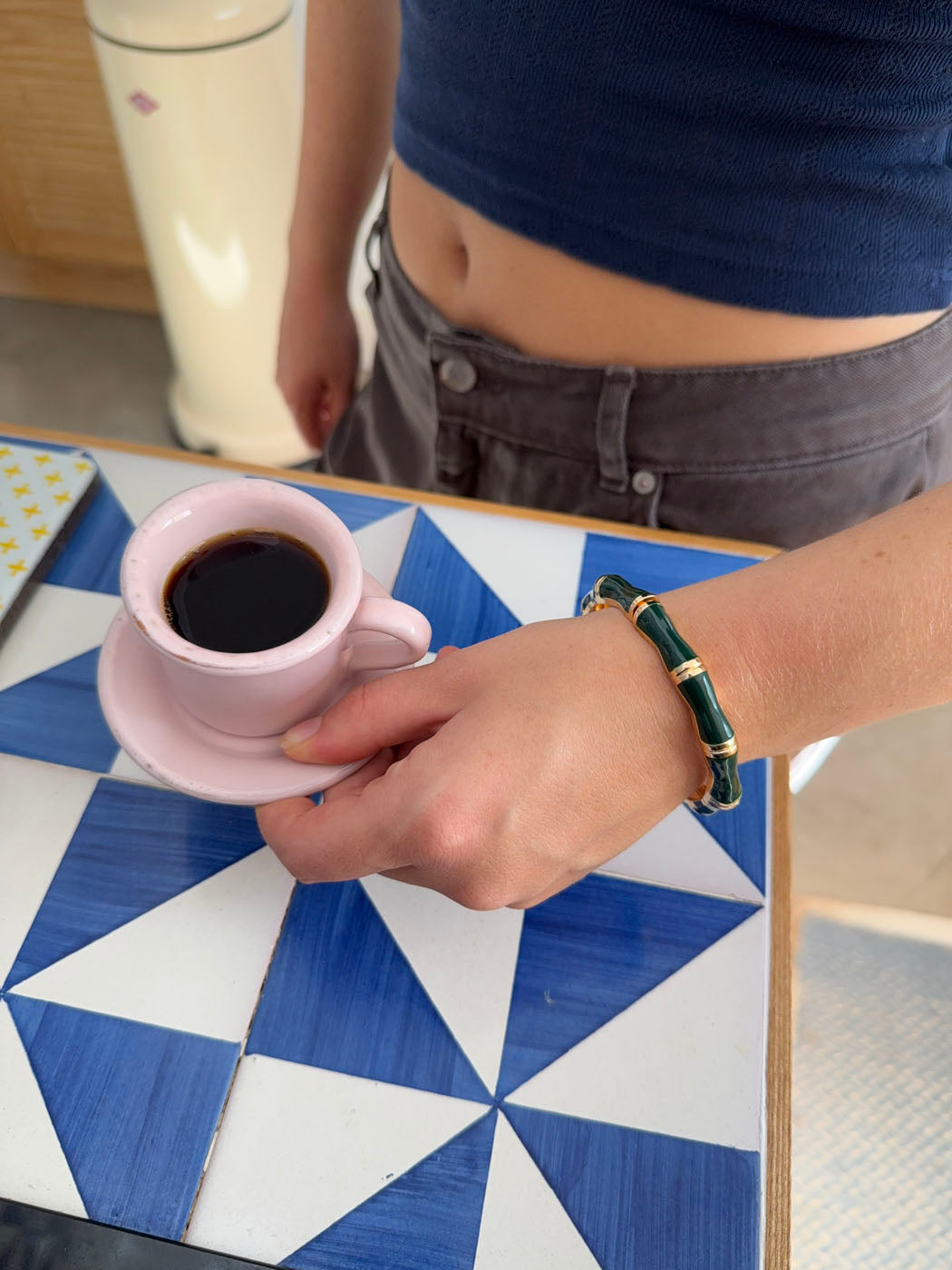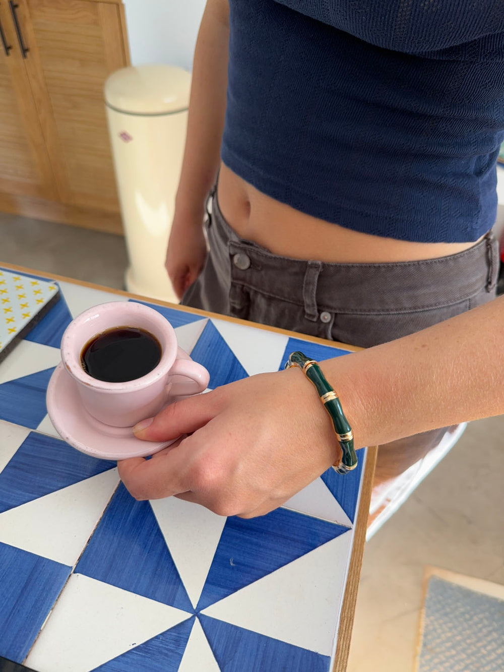 Et karakterfuldt armring-armbånd med gyldent metal og buede farvesegmenter i en smuk grøn nuance. Designet er skulpturelt og organisk, hvilket giver armbåndet et unikt og iøjnefaldende udtryk. Perfekt som statement-accessory til både hverdag og fest.