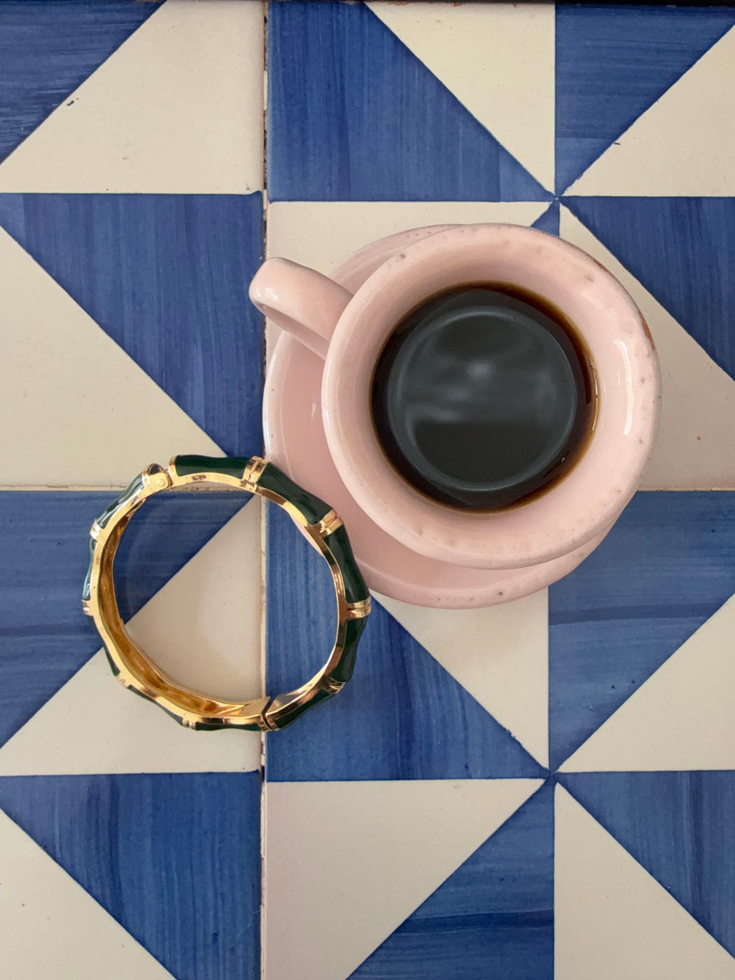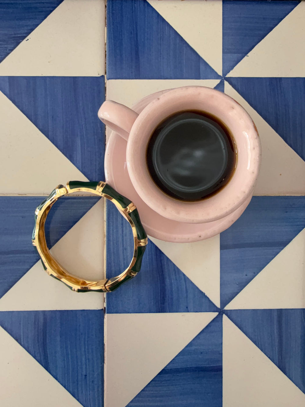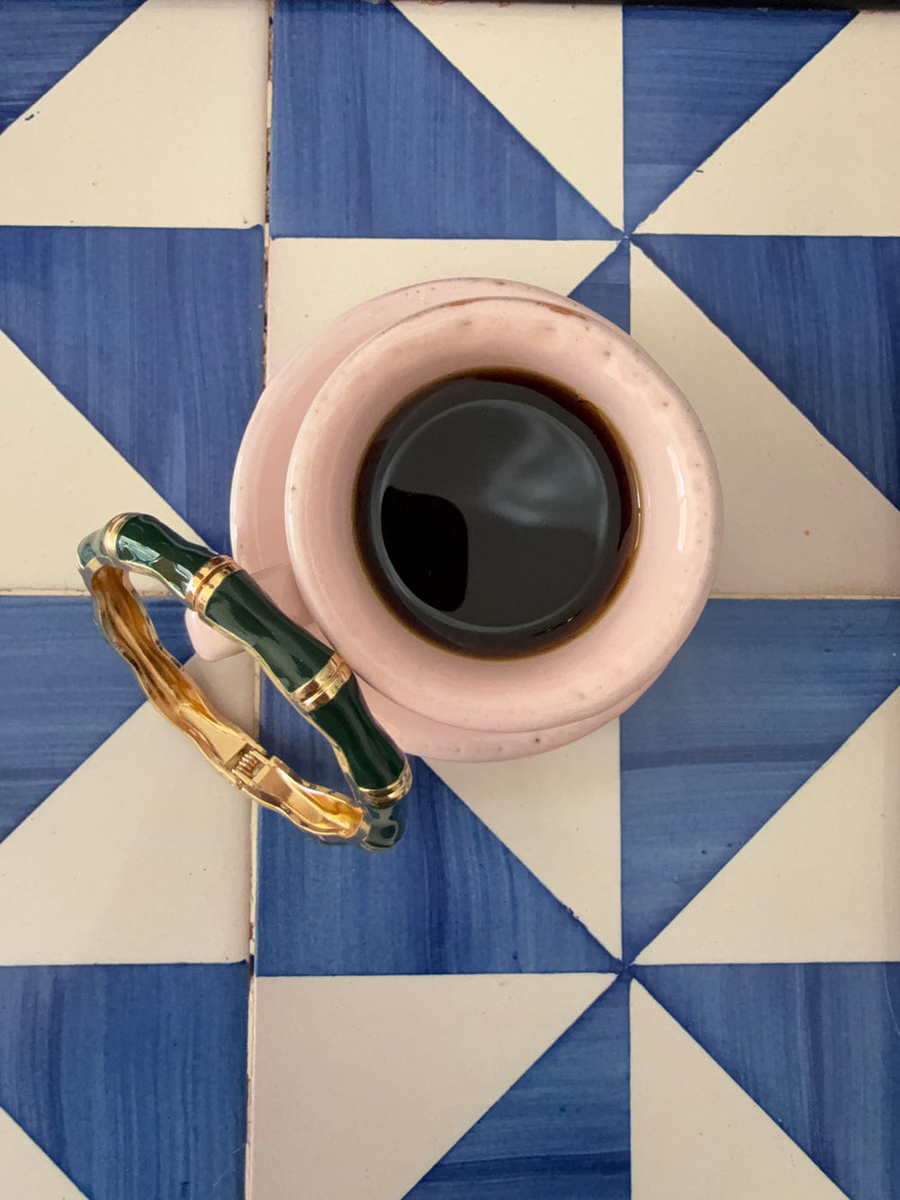 Et karakterfuldt armring-armbånd med gyldent metal og buede farvesegmenter i en smuk grøn nuance. Designet er skulpturelt og organisk, hvilket giver armbåndet et unikt og iøjnefaldende udtryk. Perfekt som statement-accessory til både hverdag og fest.