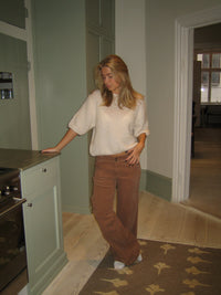 Disse fløjsbukser i blød fløjl har en løs pasform og et lavtaljet design, der giver en afslappet og stilfuld silhuet. Bukserne lukkes med lynlås og to knapper, og de har bæltetropper og lommer i siderne. Perfekte til både hverdagsbrug og mere festlige lejligheder.