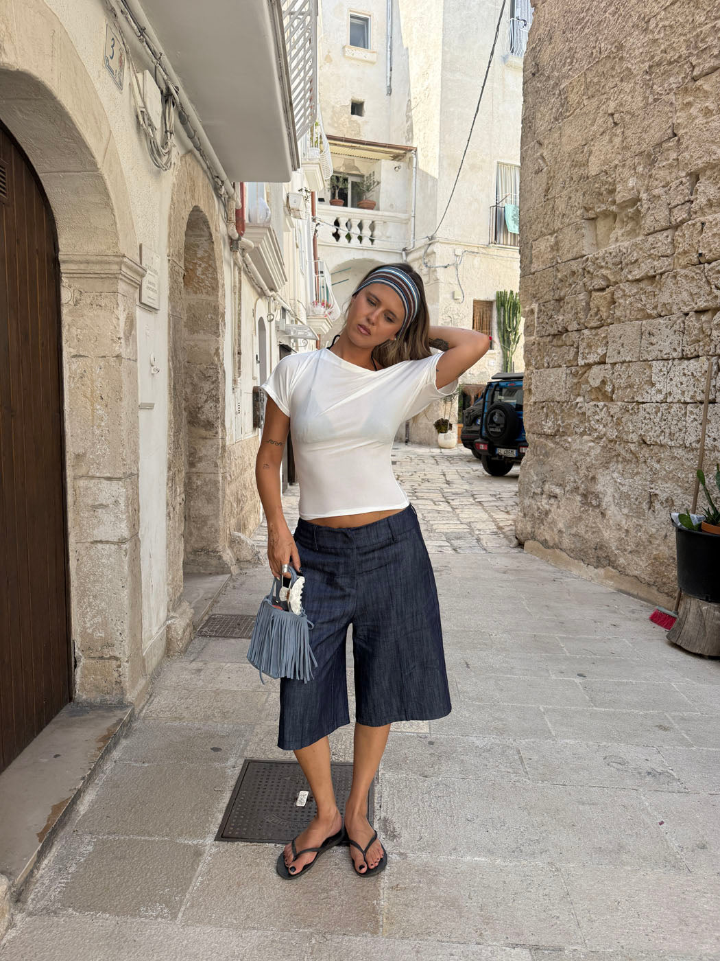 Disse mørkeblå bermuda shorts kombinerer klassisk denim look med en skræddersyet pasform. Et item, der let kan dresses op eller ned – perfekt til både hverdagsbrug og sommeroutfits.