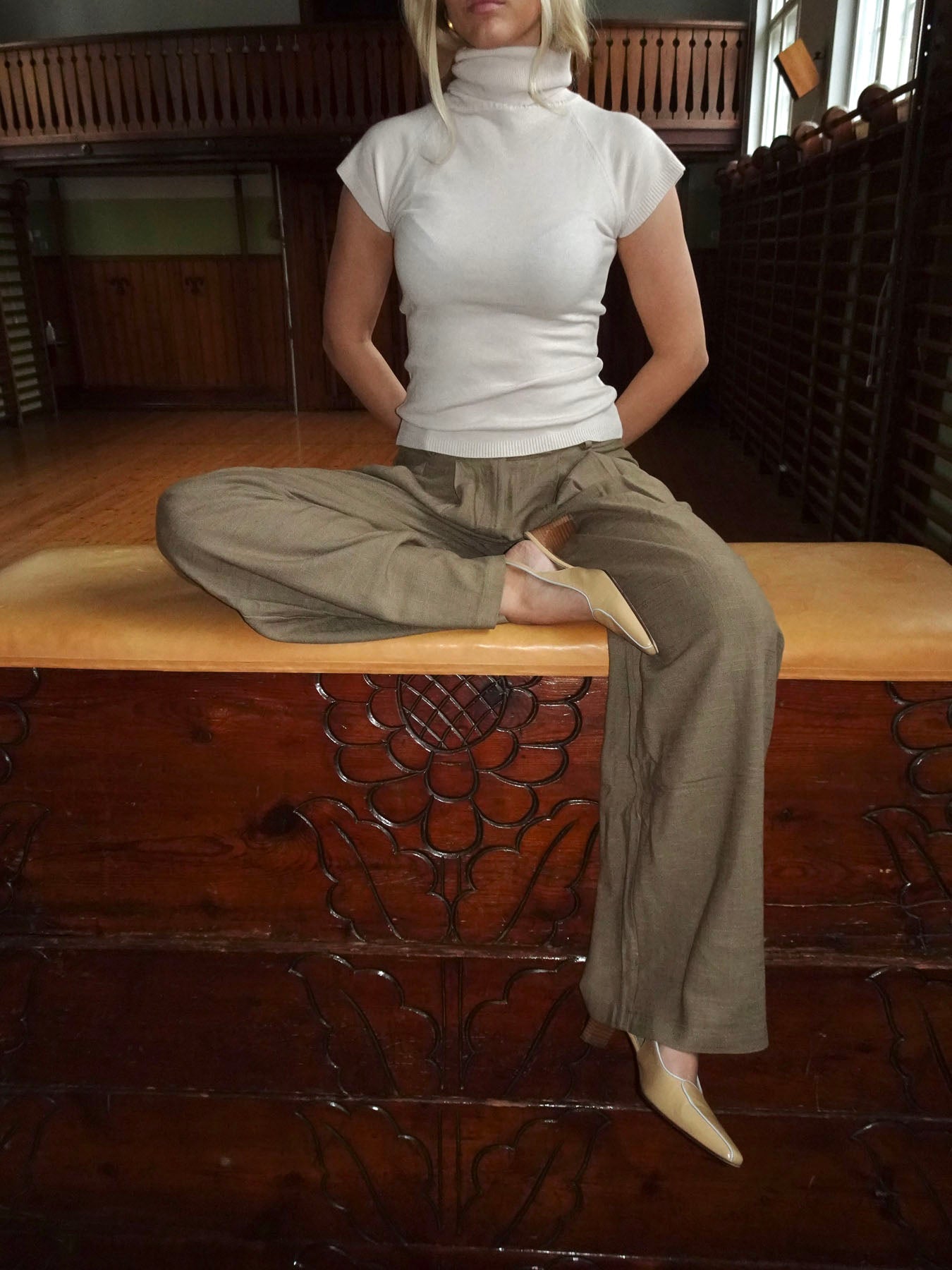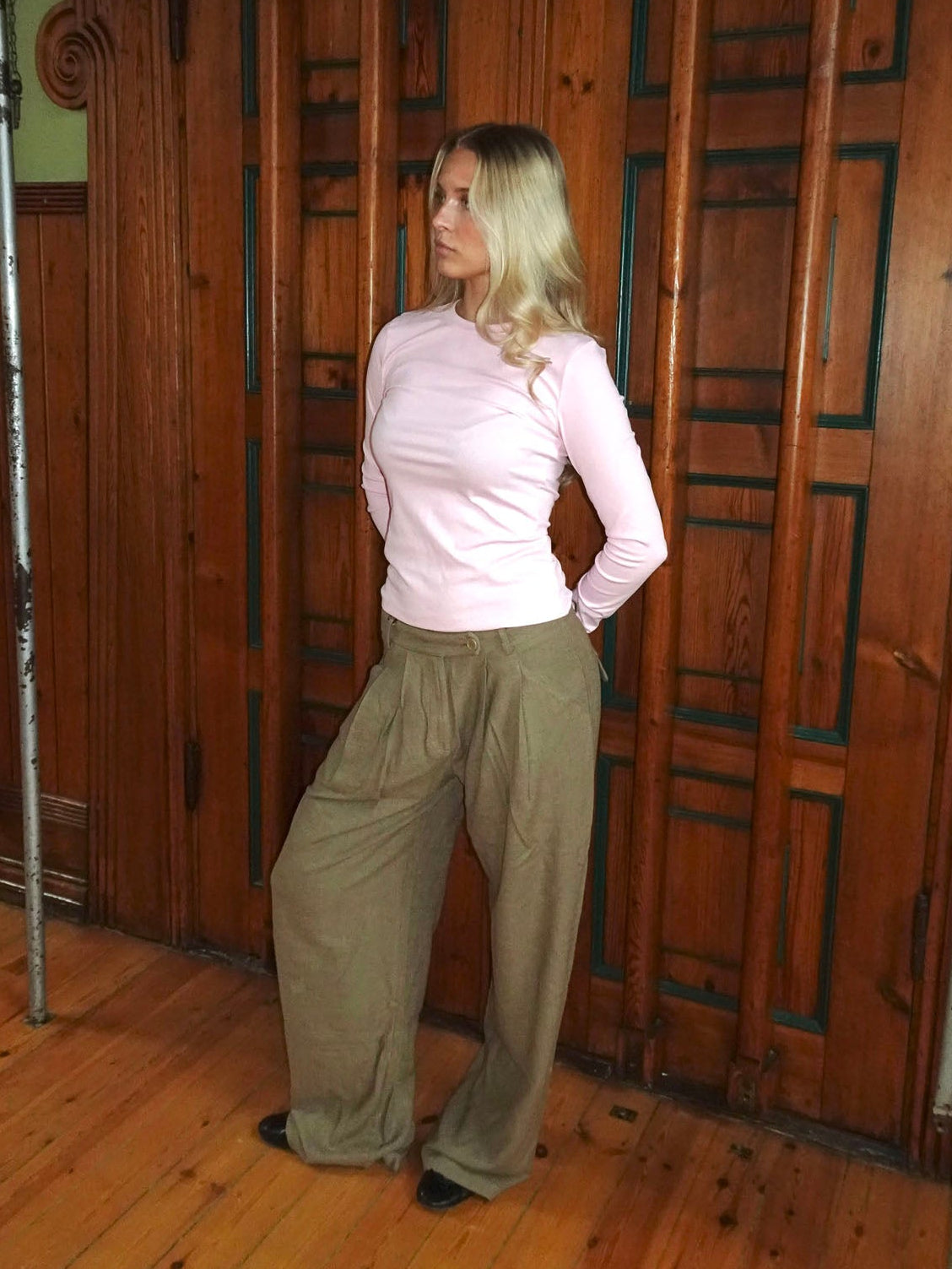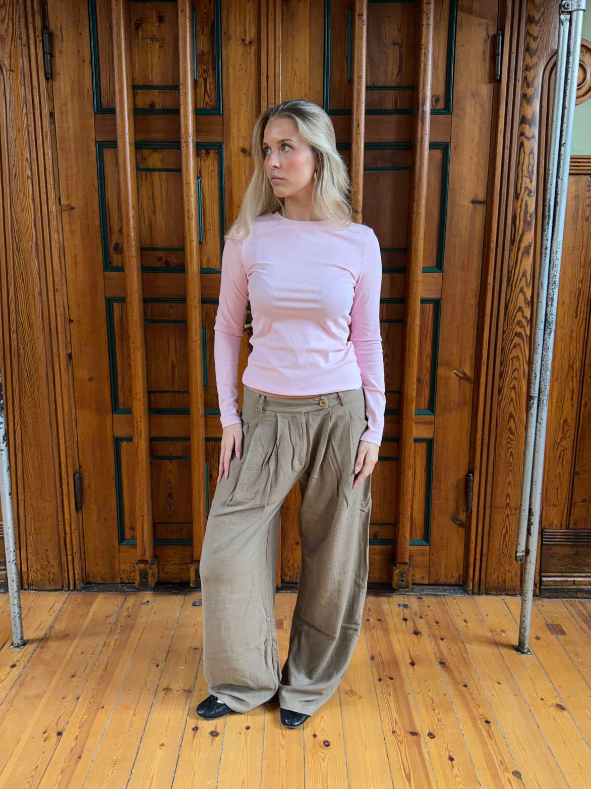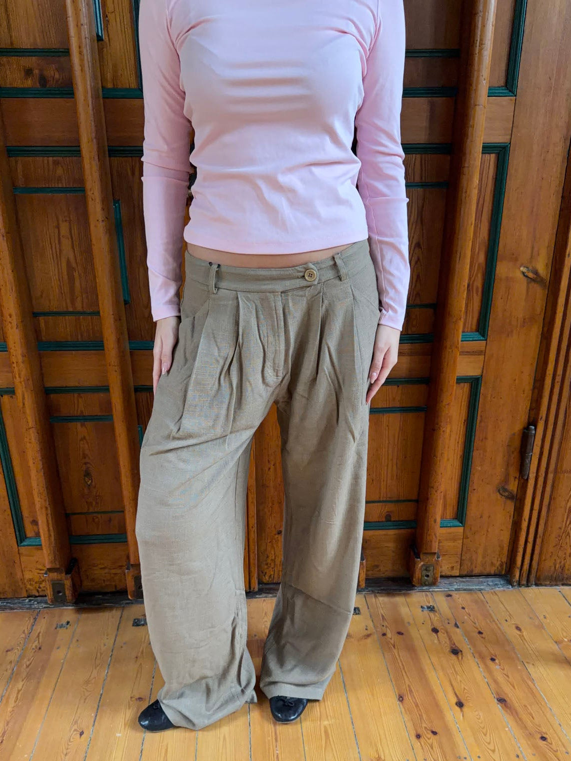 Med syninger foran, lige ben og knaplukning i taljen, får du et moderne og tidløst look, som kan styles både formelt og casual. Den varme brunlige nuance gør bukserne alsidige og nemme at kombinere med alt fra neutrale skjorter til farverige strik.