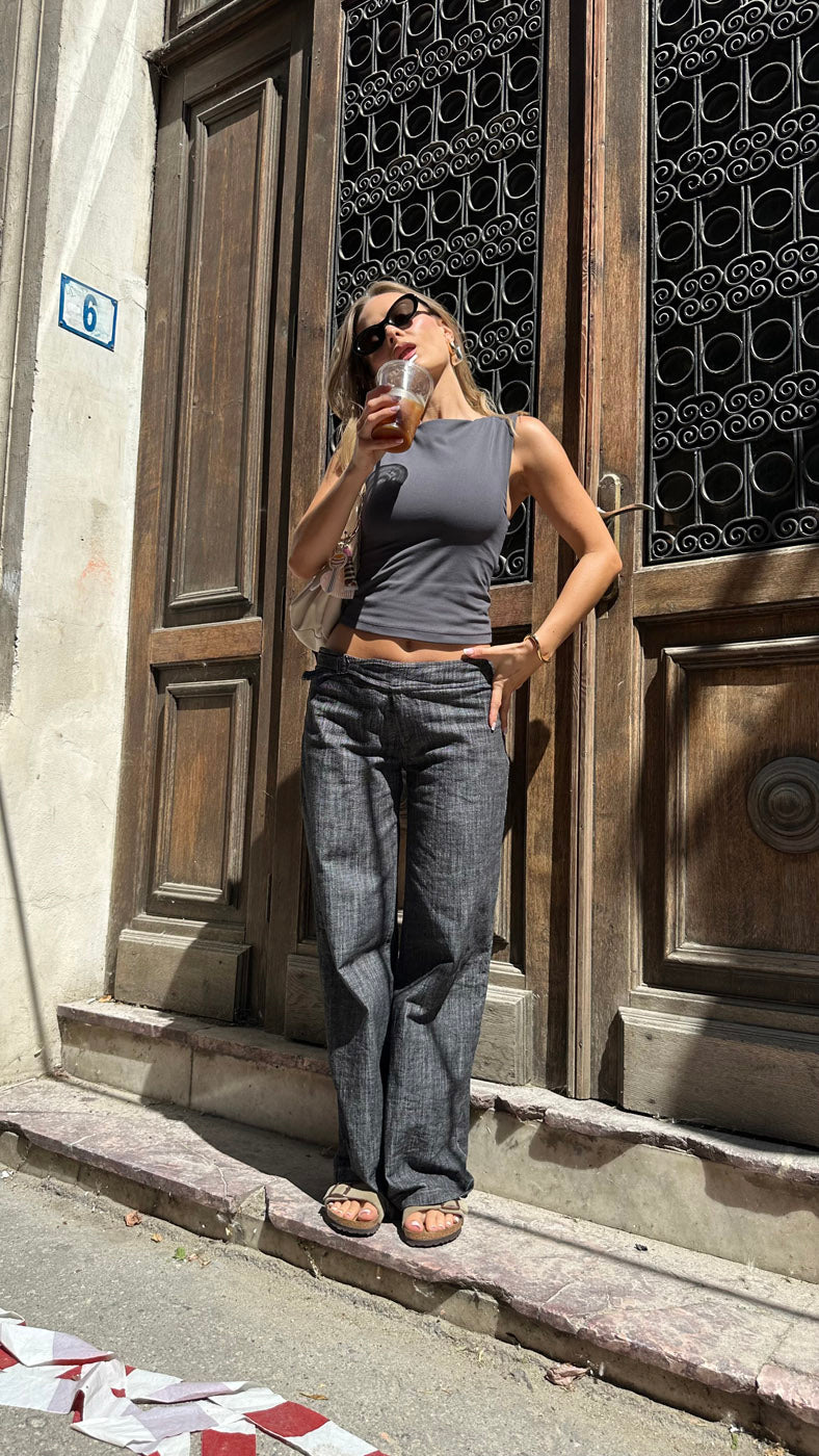 Disse elegante bukser har et klassisk fit og et stilfuldt bindebåndsbælte i taljen, der giver en flatterende pasform. Den blågrå farve tilføjer et sofistikeret touch, perfekt til både hverdagsbrug og formelle anledninger.