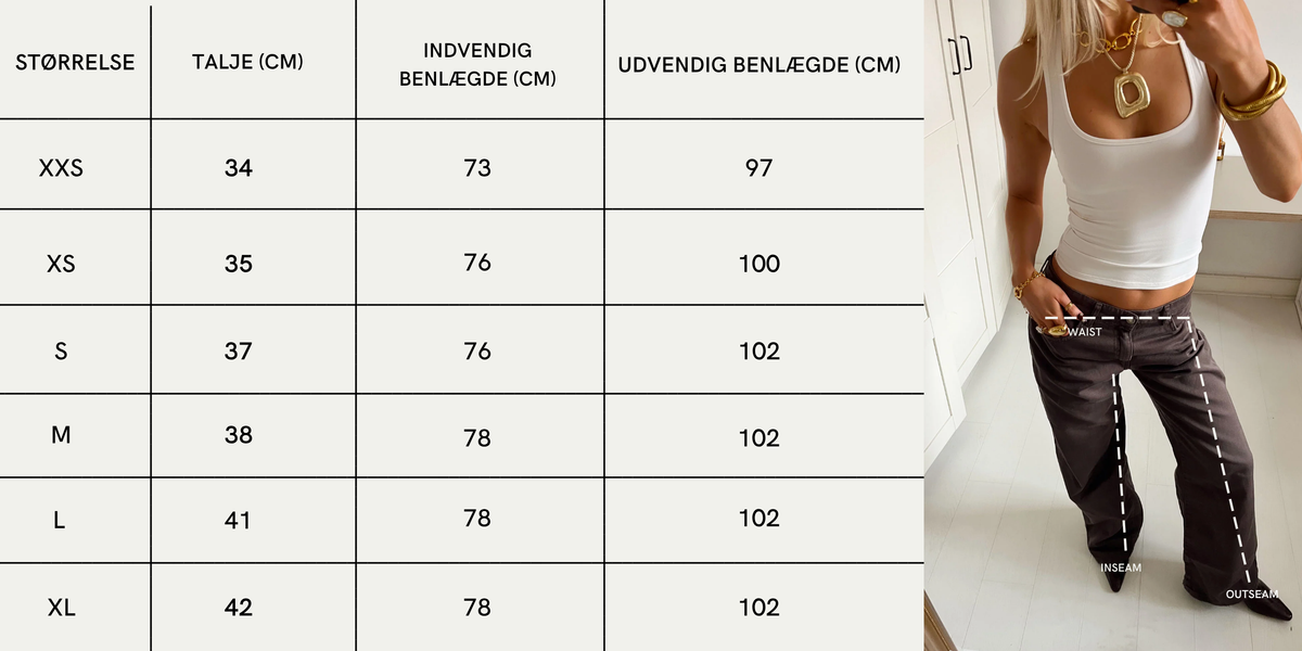 OBS: Størrelsen på denne model kan variere afhængigt af den vask, produktet har gennemgået under produktionen.