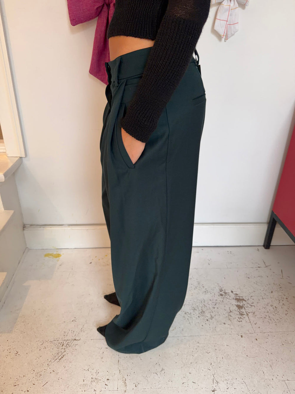 Disse elegante bukser i en dyb mørkegrøn nuance kombinerer komfort og klassisk stil i ét design. Med deres glatte materiale og let strukturerede look får du et par bukser, der både kan styles til hverdag og finere anledninger.