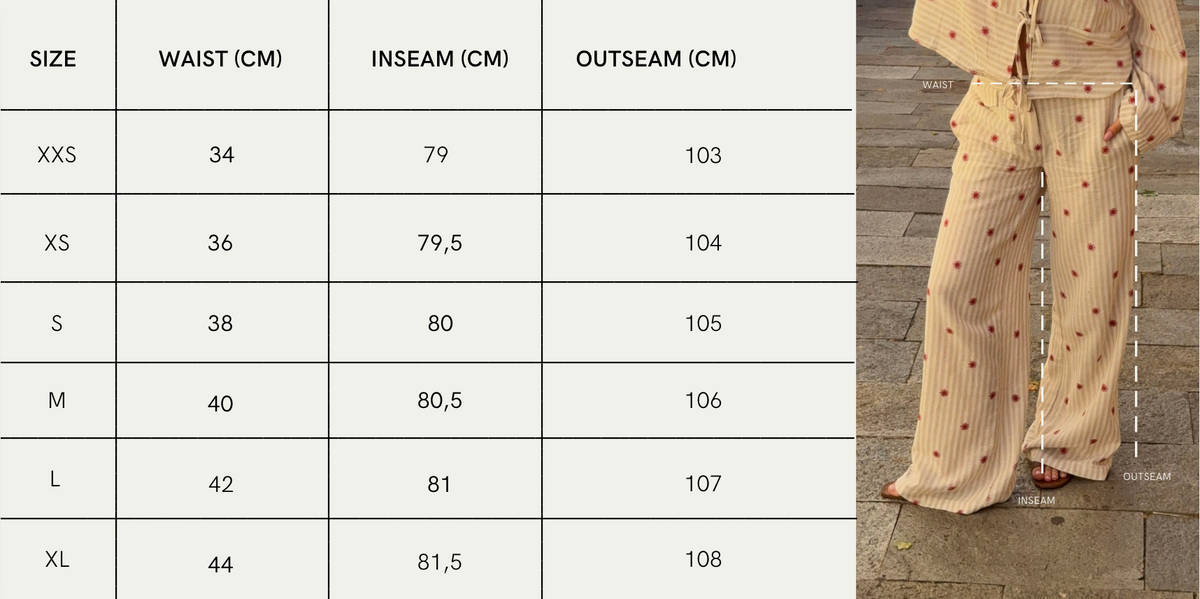 Vores Mireille bukserne kombinerer komfort og karakter i et moderne design. Det cremefarvede, stribede stof er broderet med små røde blomster, som giver et charmerende og håndværksinspireret udtryk. Bukserne har en lige, løs pasform og lukkes med lynlås og knap foran. Den let strukturerede metervare giver et casual, men gennemtænkt look – ideel til både hverdagsbrug og styling i sæt med den matchende Miran bluse.