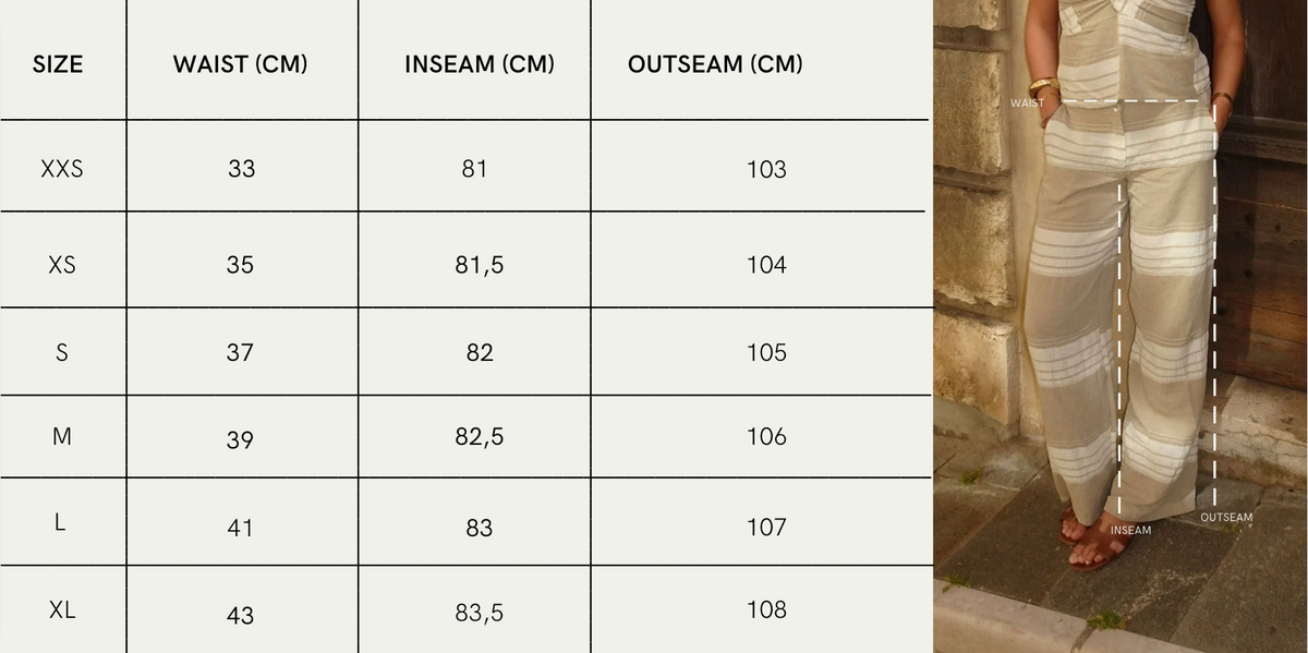 Disse brede bukser i sandfarvet og hvid stribet bomuld er designet med komfort og enkelthed i fokus. De brede vandrette striber giver et grafisk og afslappet udtryk, mens det lette materiale gør dem ideelle til varmere dage. Buksen har elastik bagpå i linningen for fleksibilitet samt knappelukning foran, hvilket kombinerer funktion med stil. Et uundværligt item til sommergarderoben – perfekt sammen med den matchende Eléonore-top eller en enkel tanktop for et effortless, koordineret look.