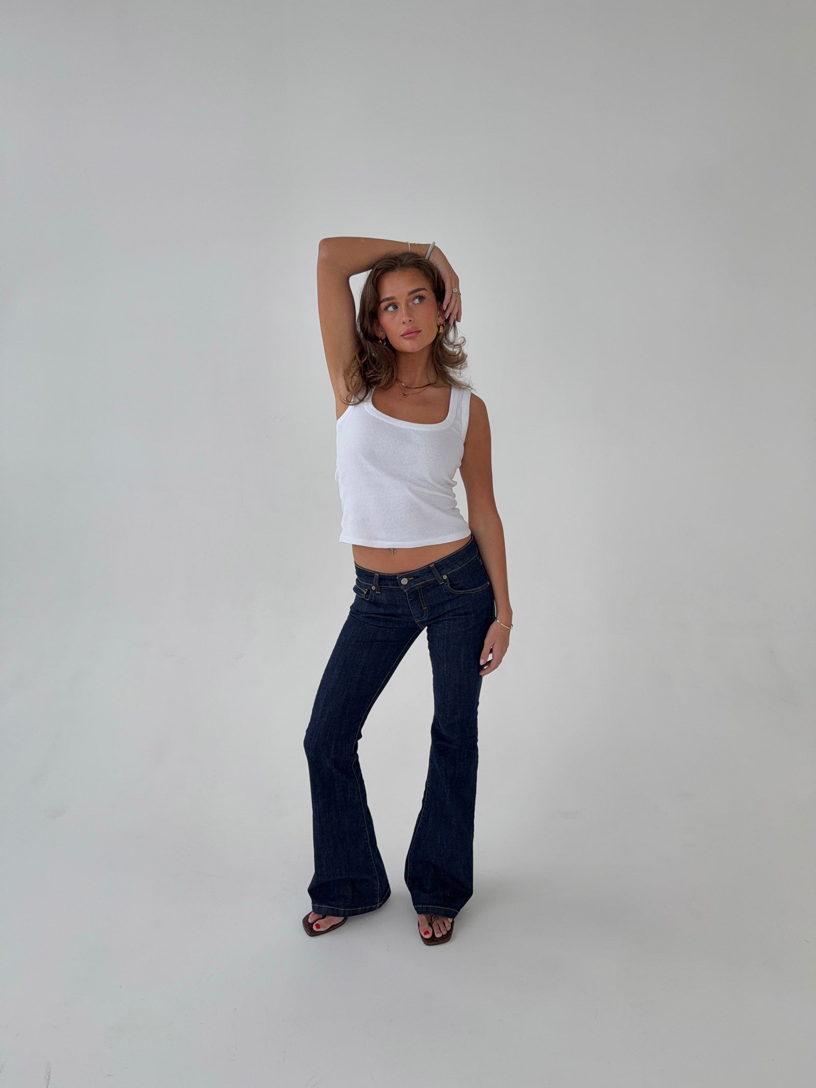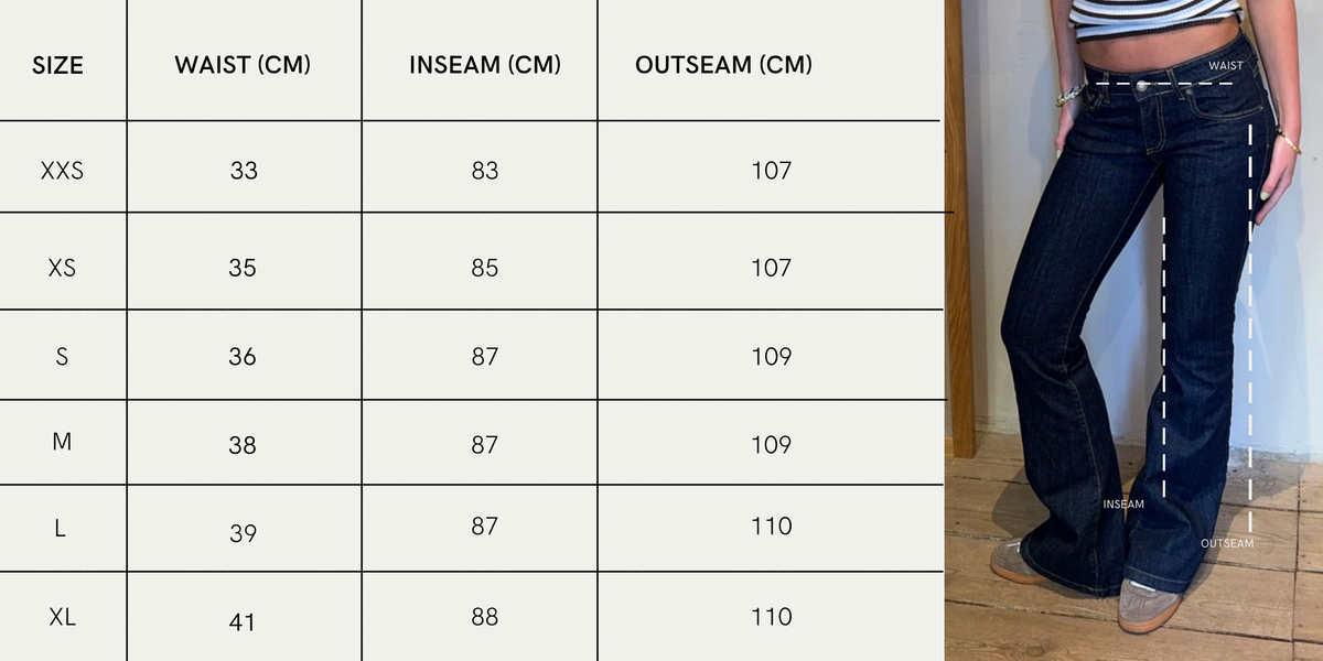 Vores bootcut jeans kombinerer et flatterende flared look med en ultra lavtaljet pasform for et feminint udtryk. De sidder tæt ved lårene og åbner elegant op fra knæet, hvilket giver en flot silhuet. Den dybe, mørkeblå denimfarve tilføjer et klassisk touch og gør dem perfekte til både hverdag og eller festlige begivenheder. Et must-have for dig, der elsker et 2000s-inspireret denim-look!