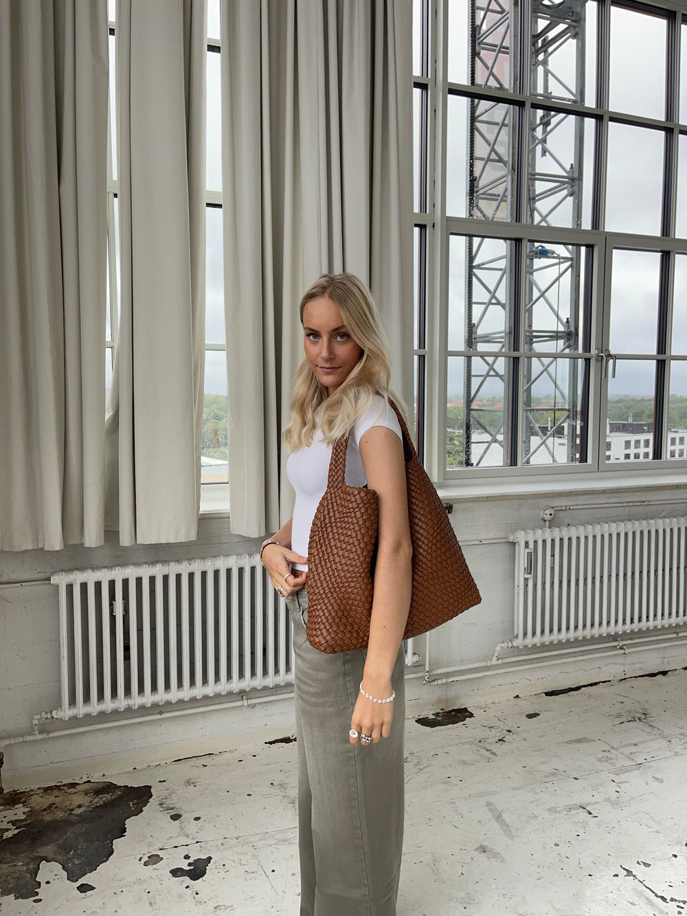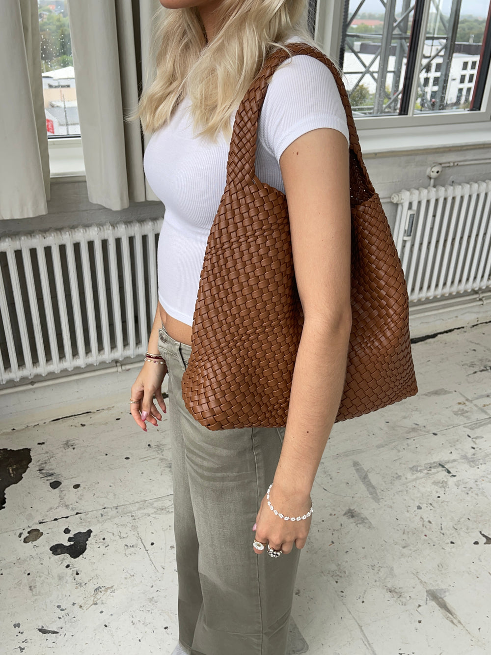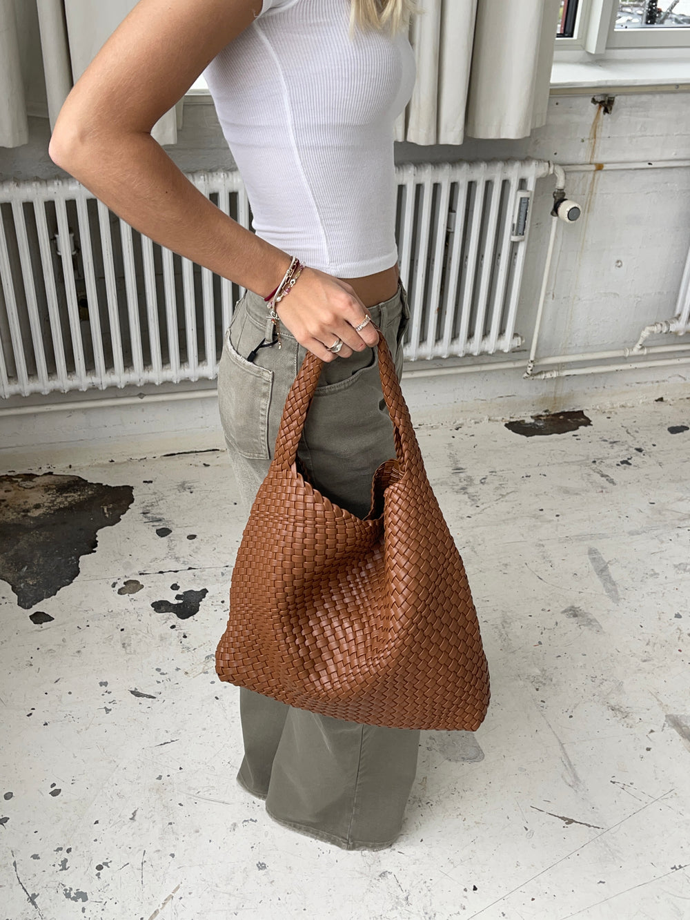 Din nye go-to hverdagstaske! Vores store flettede "New York" taske har et elegant og rummeligt design, perfekt til skole eller arbejde. Den lukkes med en praktisk magnet, hvilket gør det nemt at få fat i dine ting. Med et stort hovedrum har den plads til en MacBook 13”, notesbøger og andre essentielle genstande.