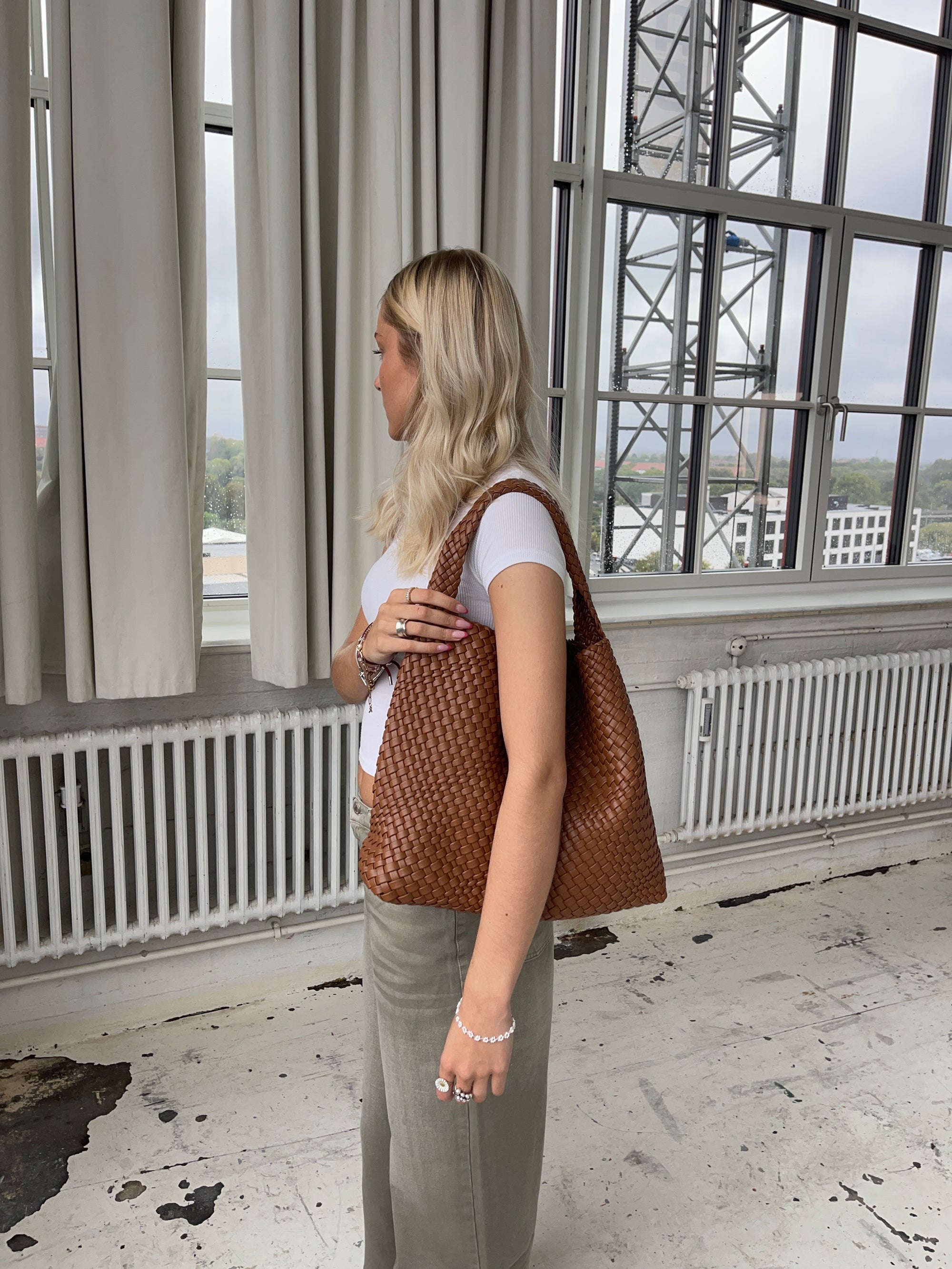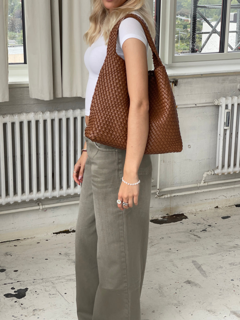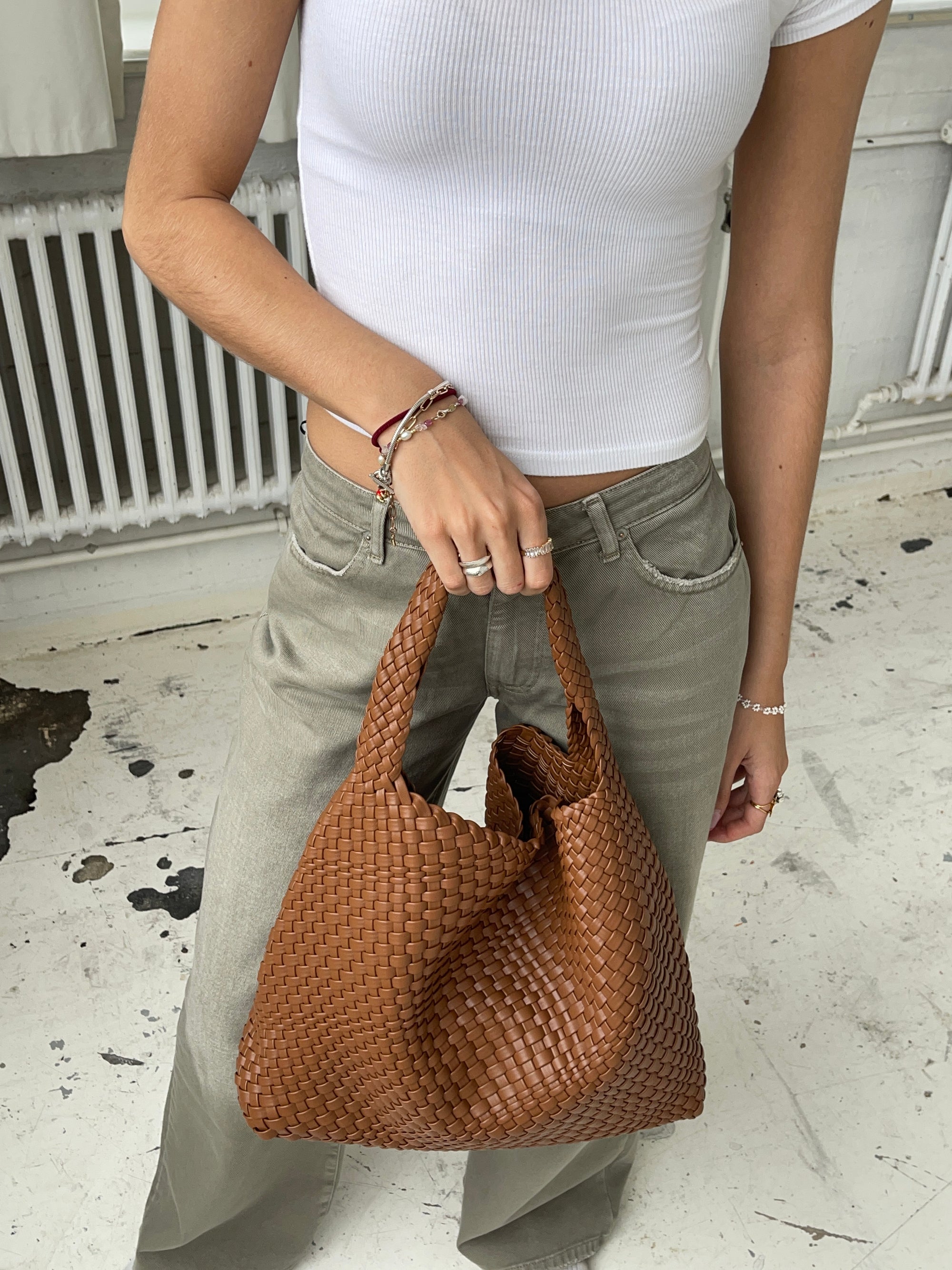Din nye go-to hverdagstaske! Vores store flettede "New York" taske har et elegant og rummeligt design, perfekt til skole eller arbejde. Den lukkes med en praktisk magnet, hvilket gør det nemt at få fat i dine ting. Med et stort hovedrum har den plads til en MacBook 13”, notesbøger og andre essentielle genstande.