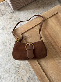 Opdag vores lille taske i ruskind, der forener stil og funktionalitet. Den smukke spændedetalje på forsiden giver et unikt præg, mens lynlåslukningen sikrer, at dine vigtigste ting opbevares sikkert. Med en praktisk strop kan du nemt smide tasken over skulderen for komfortabel bæring. Dette tidløse design gør den perfekt til både hverdag og særlige anledninger.
