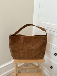 Denne store og rummelige skuldertaske i mørkebrun ruskind kombinerer elegance med funktionalitet. Den varme, brune farve giver et sofistikeret og tidløst look, mens det bløde ruskindmateriale tilføjer en luksuriøs følelse. Tasken har masser af plads til både dine daglige essentials og en 13-tommers MacBook, hvilket gør den perfekt til både arbejde og fritid. Den rummelige størrelse og den stilfulde farve gør denne taske til et alsidigt og praktisk valg, der passer til enhver garderobe.