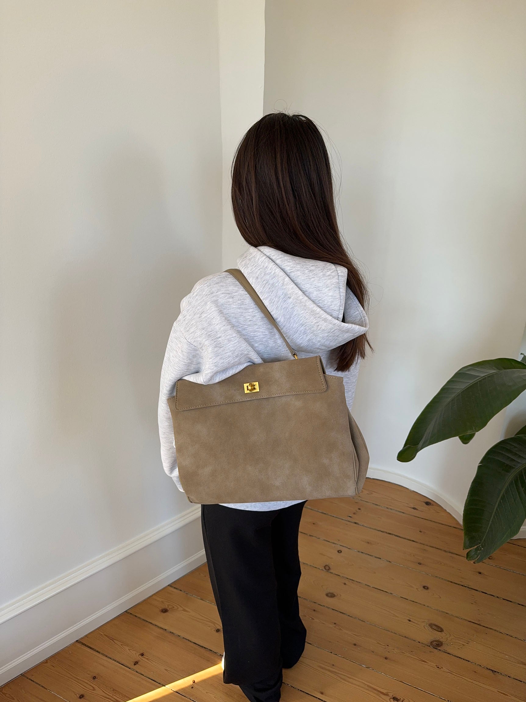 Vores Copenhagen taske er din nye Go To hvis du har brug for en taske der kan holde på det hele. Den har en enkel strop så du kan have tasken over dine skuldre samt med en guld åbning/lukning. Tasken er i imiteret ruskind og har en firkant form. Tasken er både perfekt til hverdag og festlige aftner.