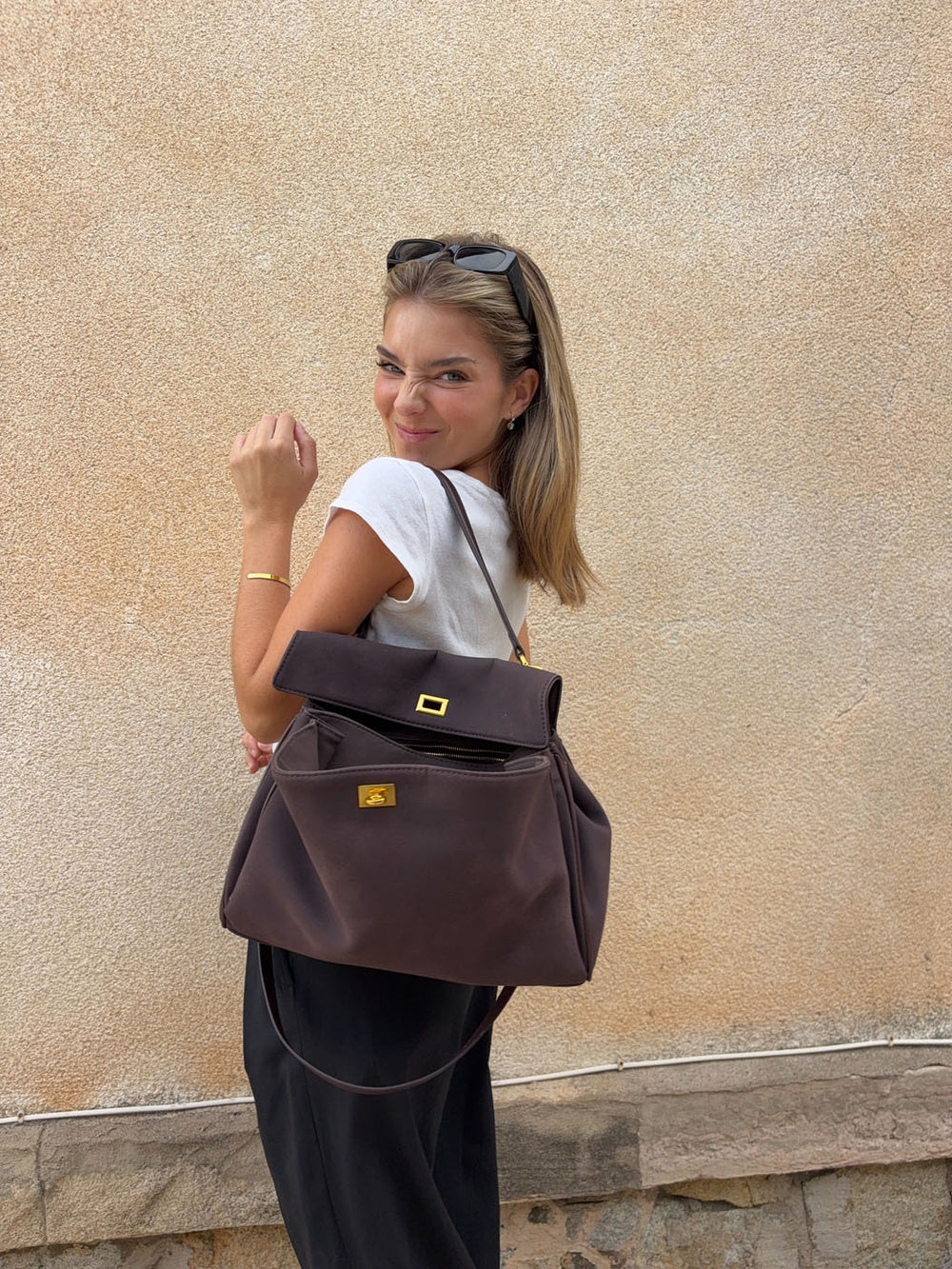 Vores Copenhagen taske er din nye Go To hvis du har brug for en taske der kan holde på det hele. Den har en enkel strop så du kan have tasken over dine skuldre samt med en guld åbning/lukning. Tasken er i imiteret ruskind og har en firkant form. Tasken er både perfekt til hverdag og festlige aftner.