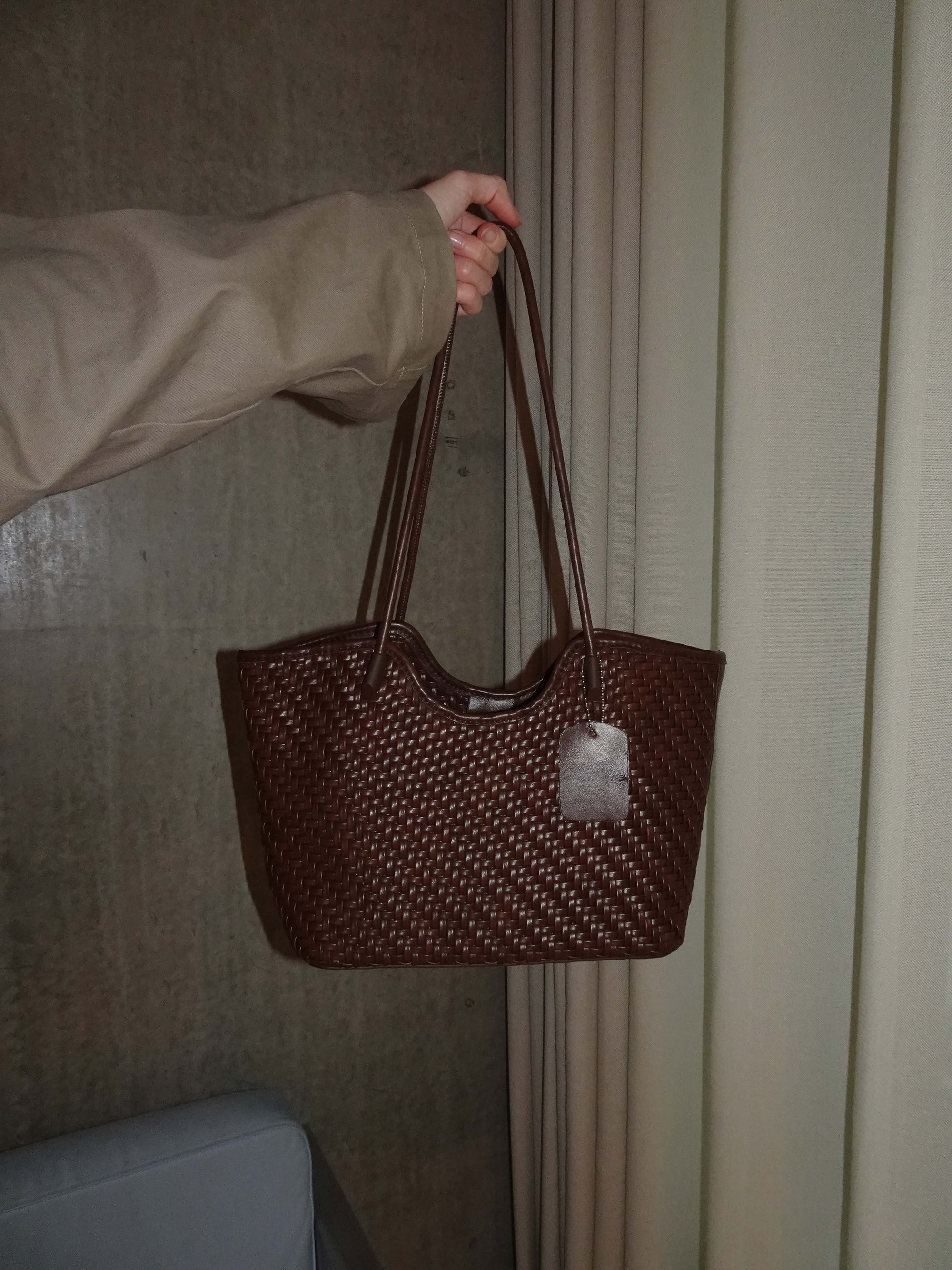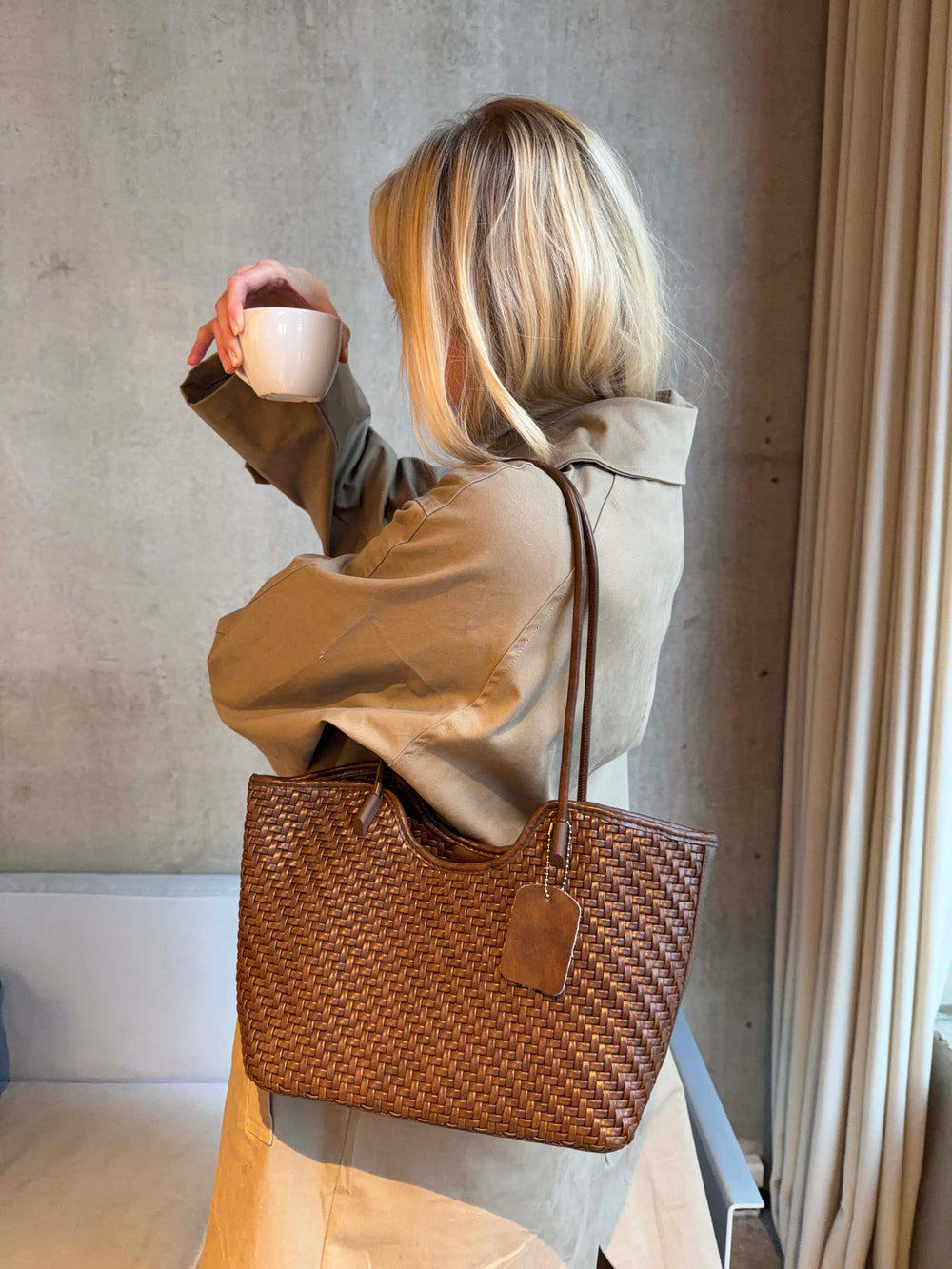 Denne flettede brown tote bag er til dig, der elsker et stilrent look, men stadig vil have en taske, der skiller sig ud på den cool måde. Det flettede mønster giver tasken et luksuriøst vibe, mens den varme brune farve gør den super nem at matche med både skoleoutfits, café-looks og outfits til byturen.