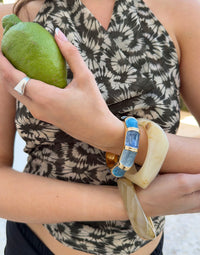 Et karakterfuldt armring-armbånd med gyldent metal og buede farvesegmenter i varme nuancer som koral, creme og brun. Designet er skulpturelt og organisk, hvilket giver armbåndet et unikt og iøjnefaldende udtryk. Perfekt som statement-accessory til både hverdag og fest.