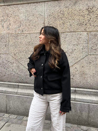 Denne jakke har en kort og løs pasform. Jakken har reverser og 2 store lommer foran. Den har en knappelukning og knappedetalje på ærmerne.
