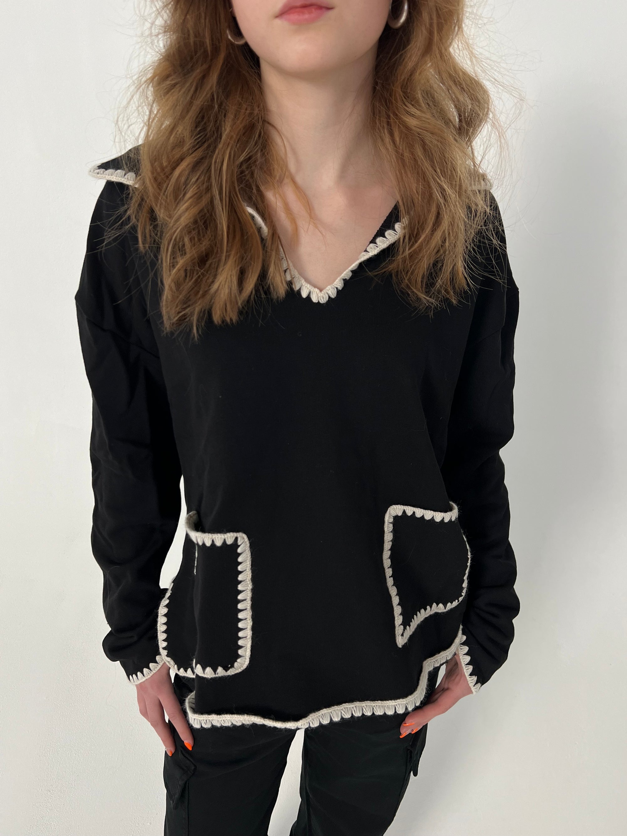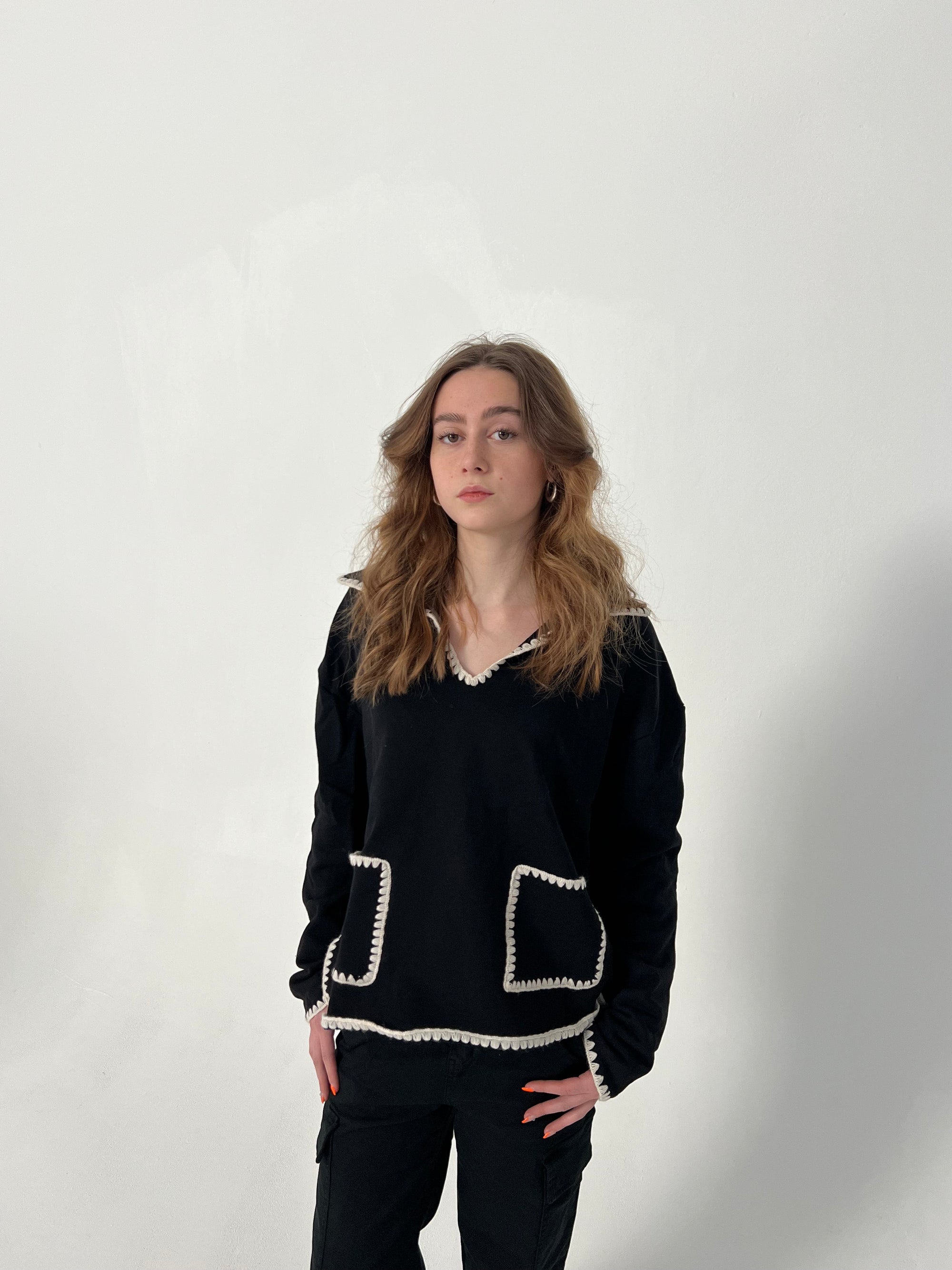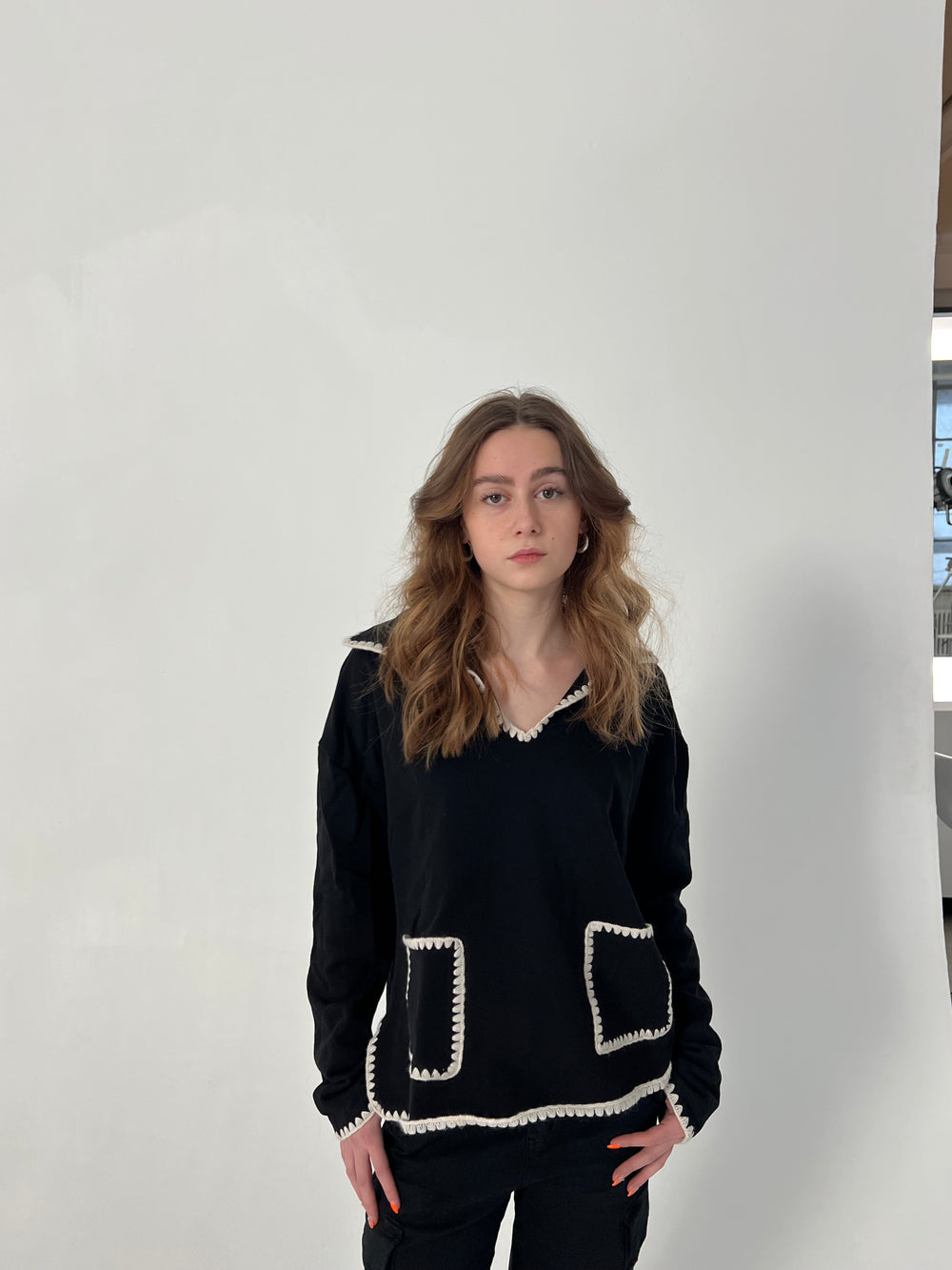 Denne bluse har en løs pasform og består af hvide "syning" detaljer, som gør den super unik. Blusen er designet med en v-udskæring og en krave. Blusen har lange ærmer og 2 store lommer foran