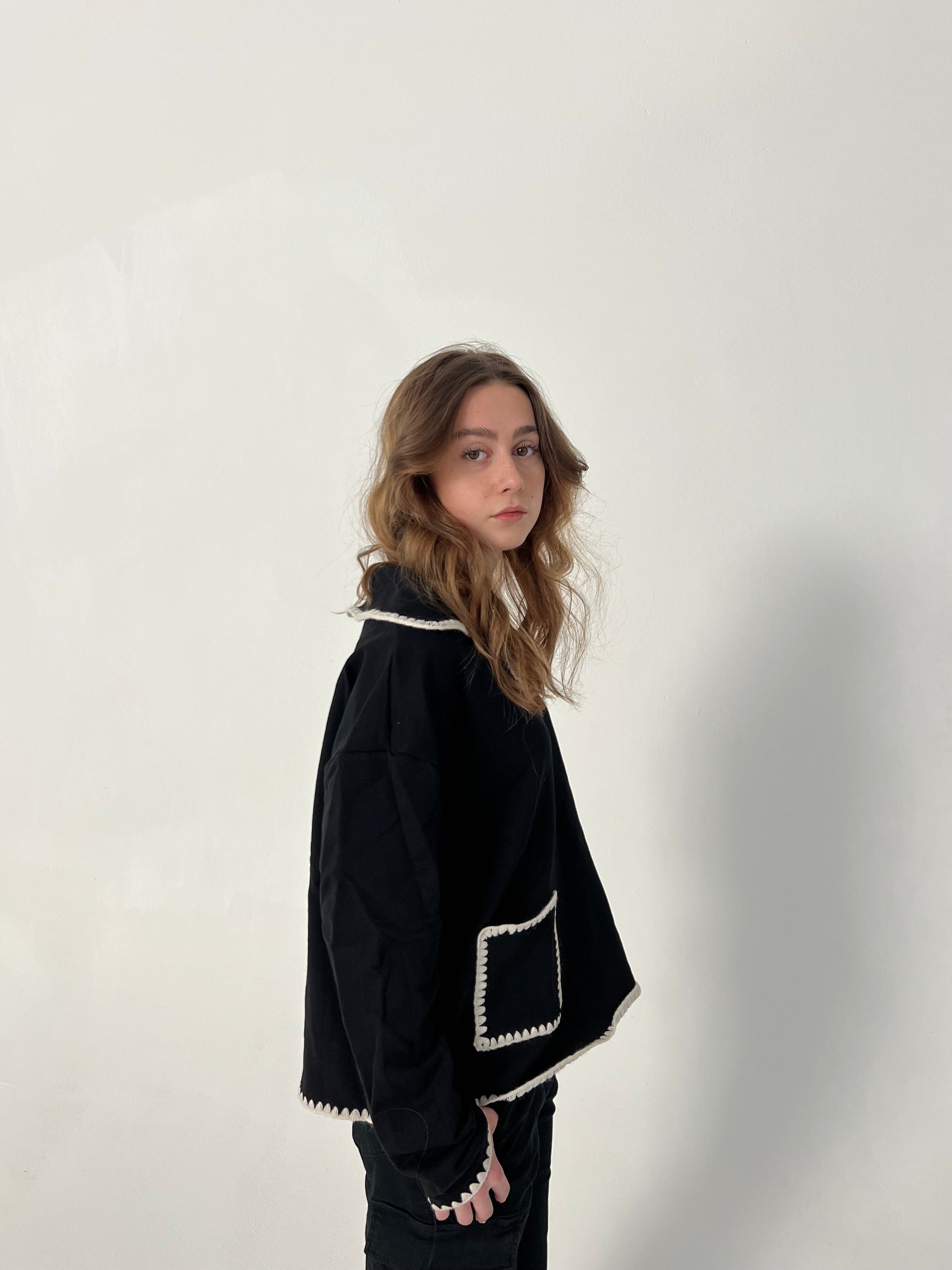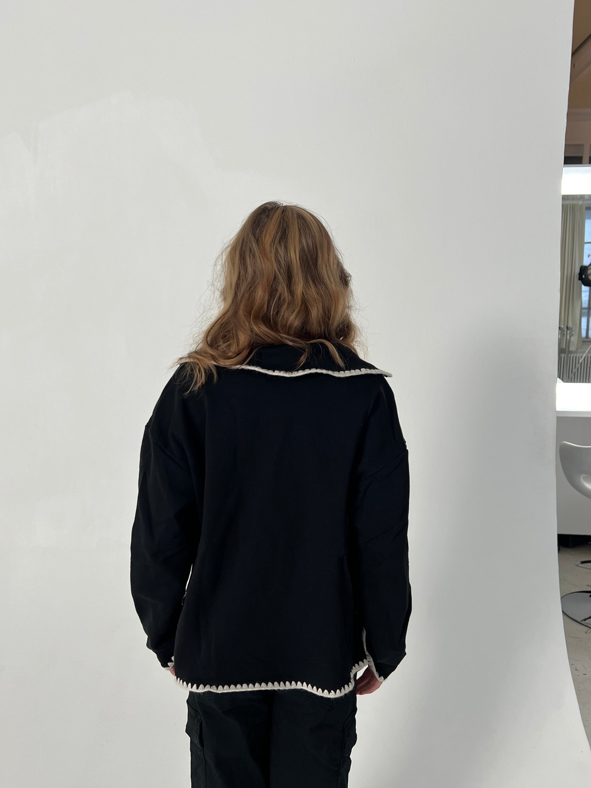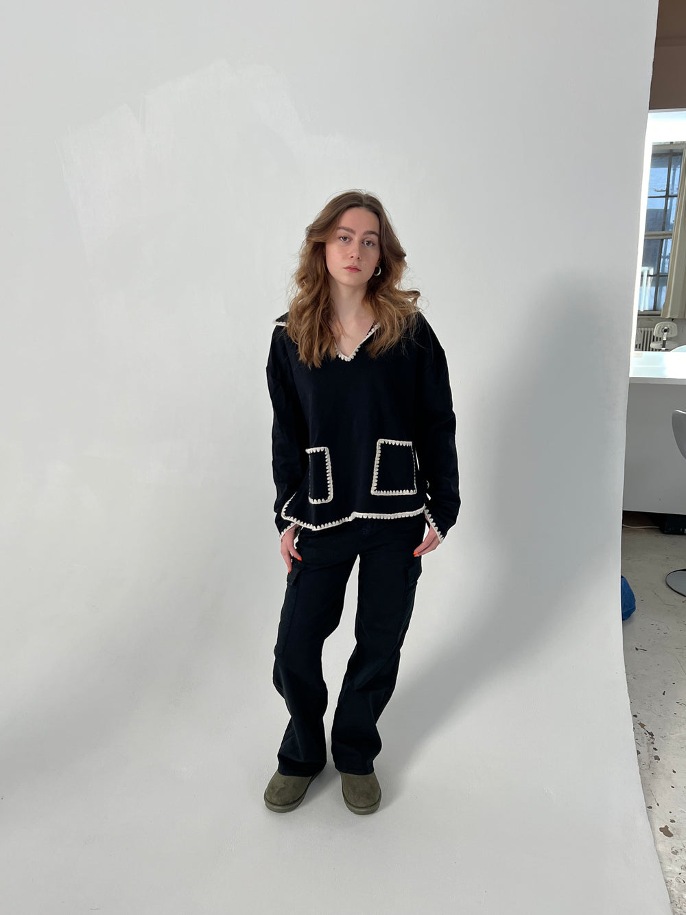 Denne bluse har en løs pasform og består af hvide "syning" detaljer, som gør den super unik. Blusen er designet med en v-udskæring og en krave. Blusen har lange ærmer og 2 store lommer foran