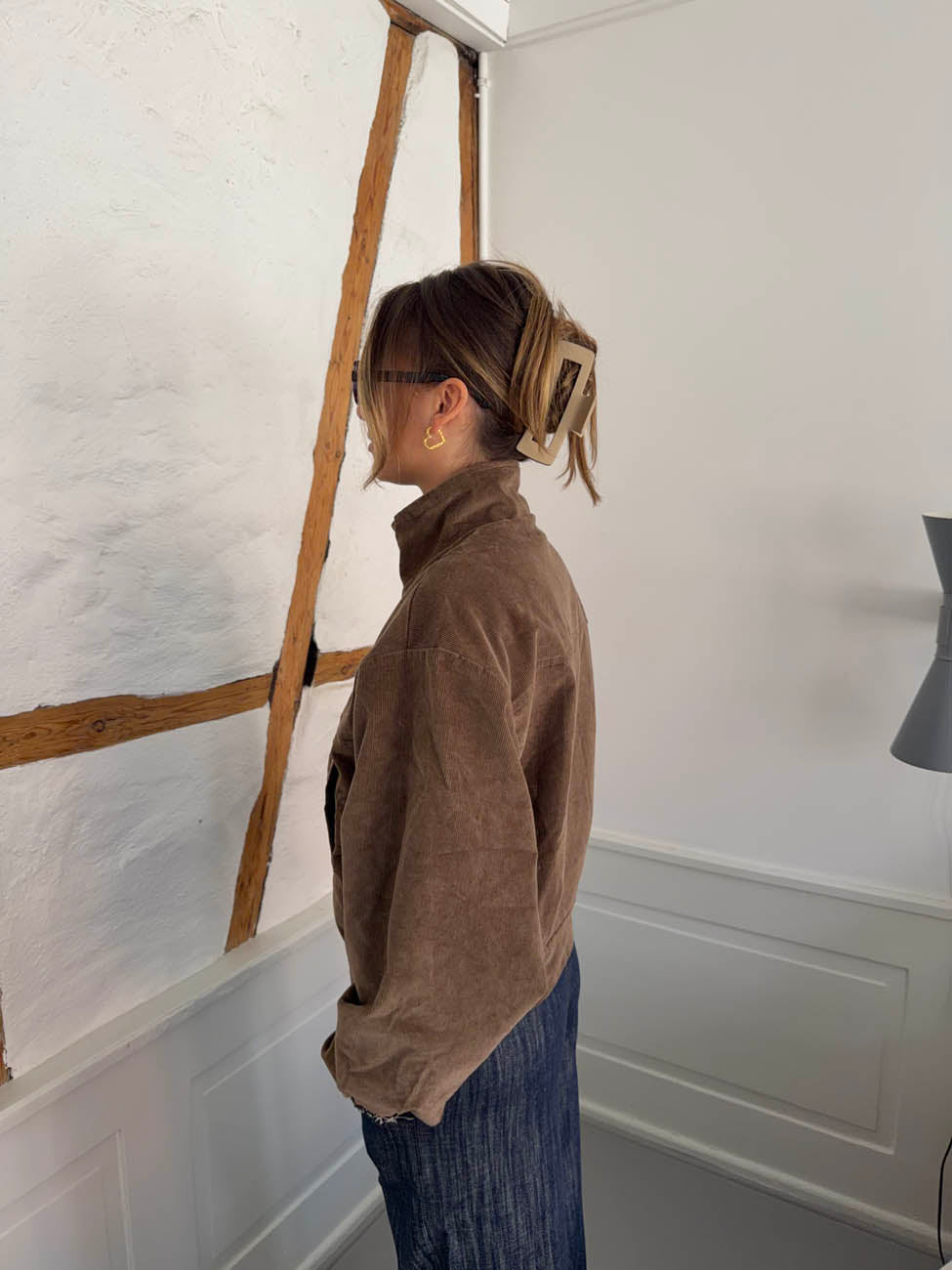 Fremstillet i blødt, struktureret fløjlsmateriale, giver den et eksklusivt udtryk og en behagelig følelse. Den høje krave og trykknapperne foran tilføjer et minimalistisk look, mens de rummelige sidelommer giver både funktion og stil.