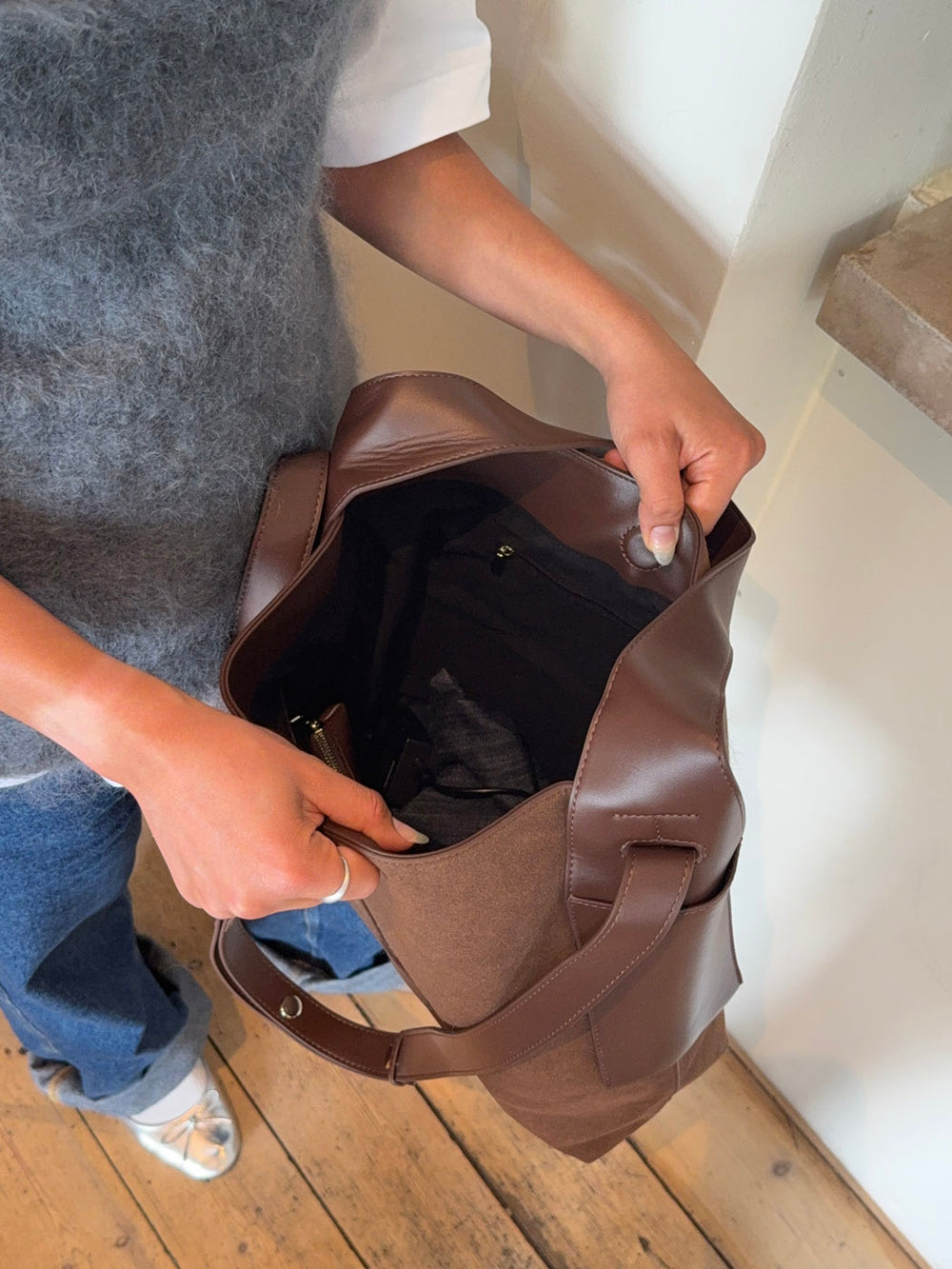 Sile er en rummelig og stilren skuldertaske i blødt materiale med en jordnær brun tone. De praktiske sidelommer giver ekstra opbevaringsplads, mens det minimalistiske design gør tasken alsidig til både hverdag og arbejde. En funktionel og elegant taske med et afslappet, moderne udtryk.
