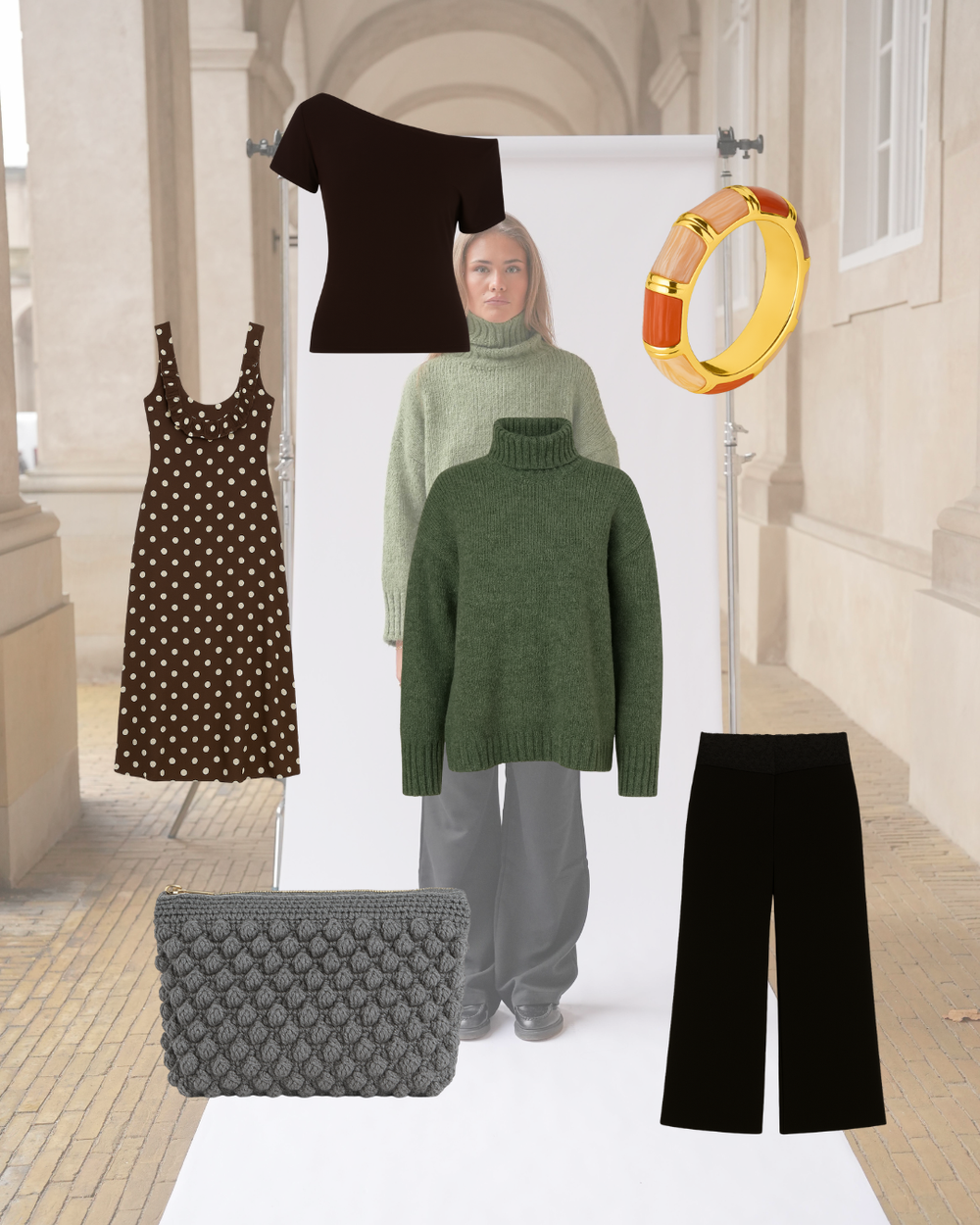 Pakken indeholder både strik, kjole, suit pants, tee, clutch og et smukt armbånd, så du får en komplet kombination af både hverdagsfavoritter og statement pieces.
