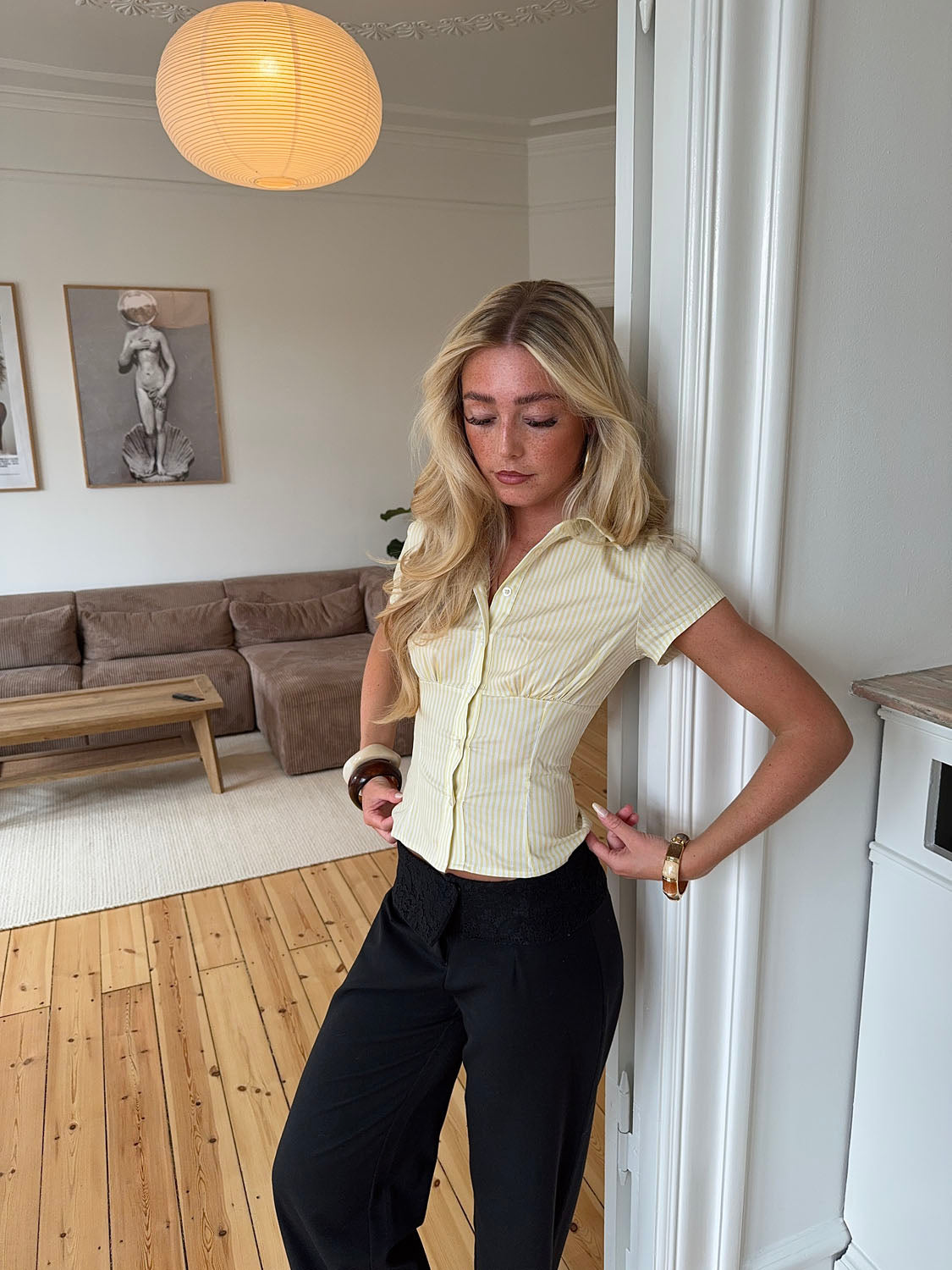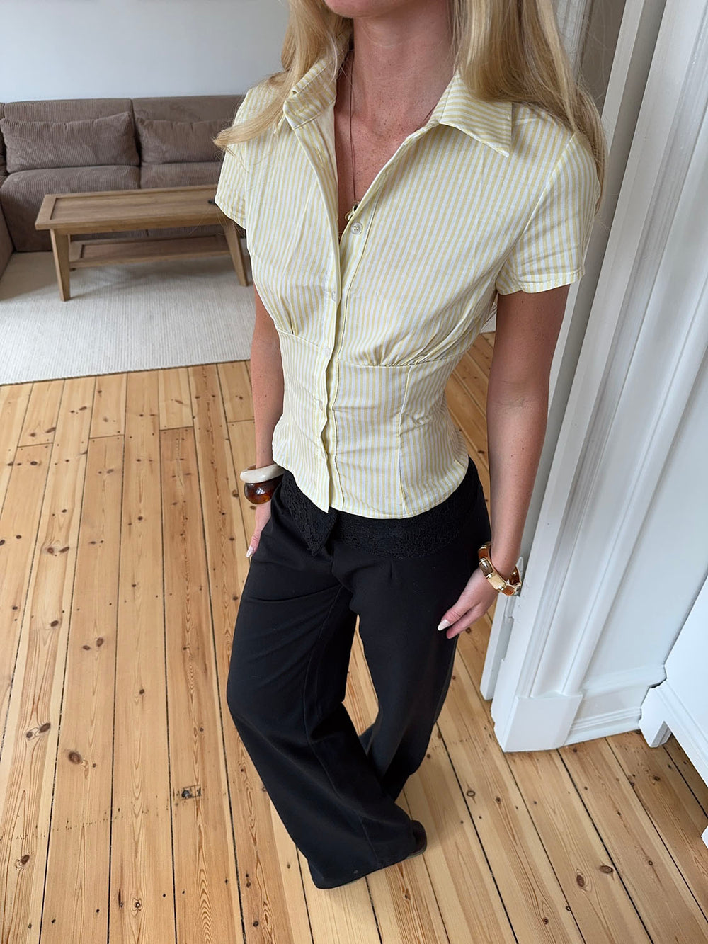 Carolina kortærmet skjorte i hvid og gul er en tætsiddende skjorte med et klassisk ternet mønster. Den kortærmede model har en enkel og feminin pasform, som sidder tæt uden at stramme. Skjorten er lavet i et let materiale, der føles behageligt mod huden og egner sig godt til både hverdagsbrug og mere afslappede, pæne anledninger. Det diskrete design gør den nem at style med både bukser, nederdele eller under en let jakke.