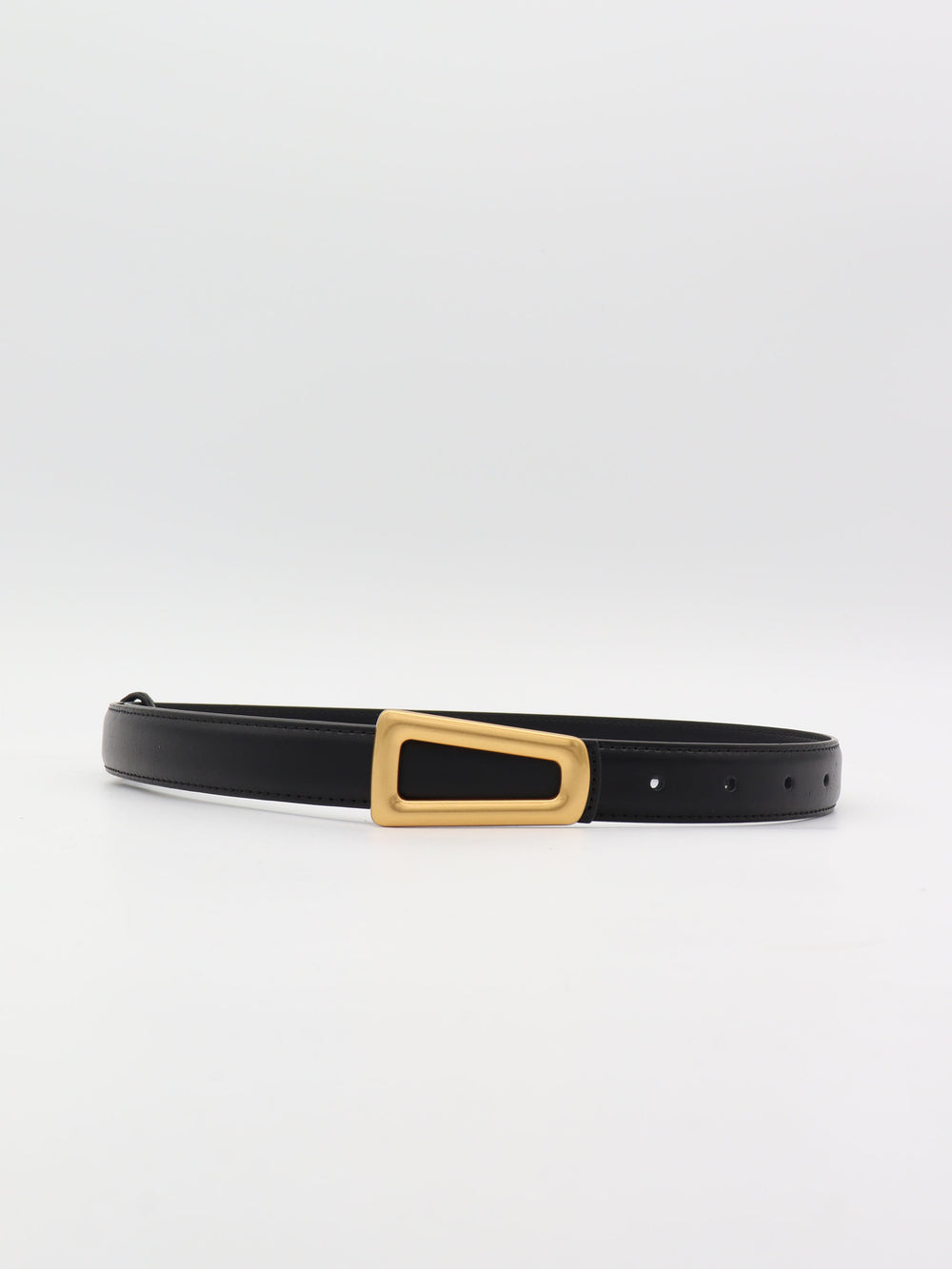 Tilføj et sofistikeret finish til dit outfit med vores "Luce bælte" i sort med gulddetaljer. Det smalle design i glat imiteret læder kombineres med et elegant, rektangulært spænde i børstet guld, der skaber et tidløst og raffineret look.