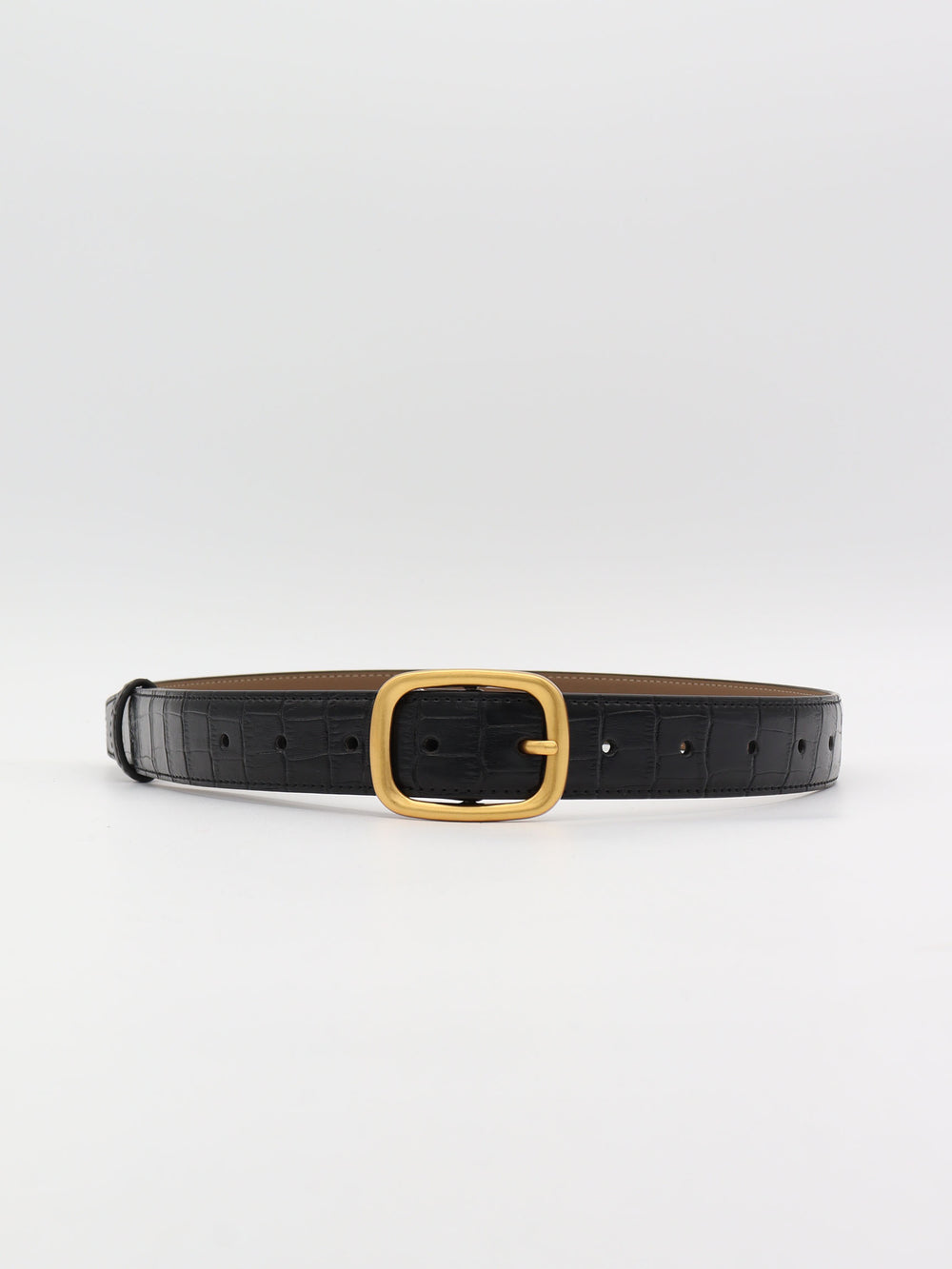 Opgrader din garderobe med dette smukke sorte bælte i croco-præget design – et accessory, der oser af luksus og tidløs stil. Det elegante croco-mønster giver bæltet en eksklusiv struktur, som løfter selv de mest enkle outfits. Kombineret med det matte guldfarvede spænde får du et sofistikeret look, der både er klassisk og moderne på samme tid.