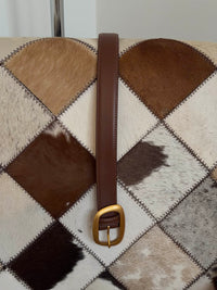 Dette er et stilfuldt og moderne taljebælte fremstillet af imiteret læder. Det har et slankt, minimalistisk design, der løftes af et karakteristisk ovalt spænde i en banket guld tone. Spændet tilføjer et farverigt element og et diskret retro-touch til det samlede look. Perfekt til at kombinere med neutrale eller jordfarvede outfits, forener dette bælte funktionalitet med et moderne udtryk og er ideelt til både afslappede og elegante looks.
