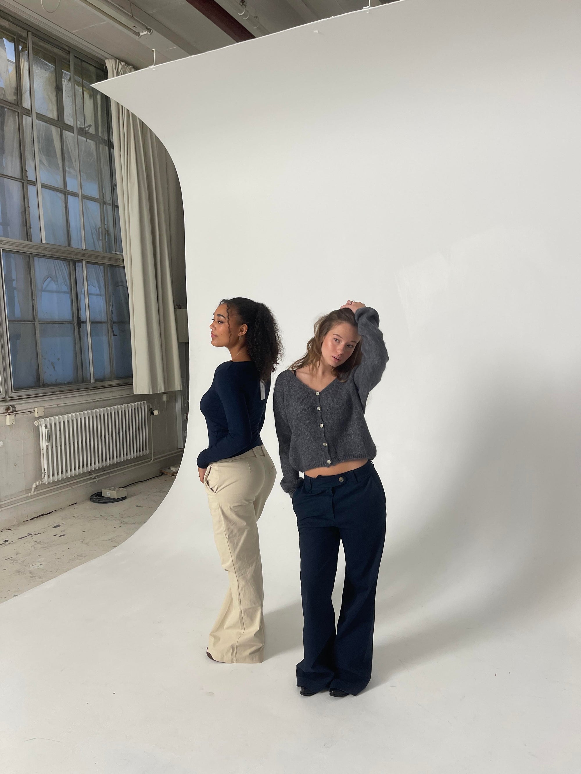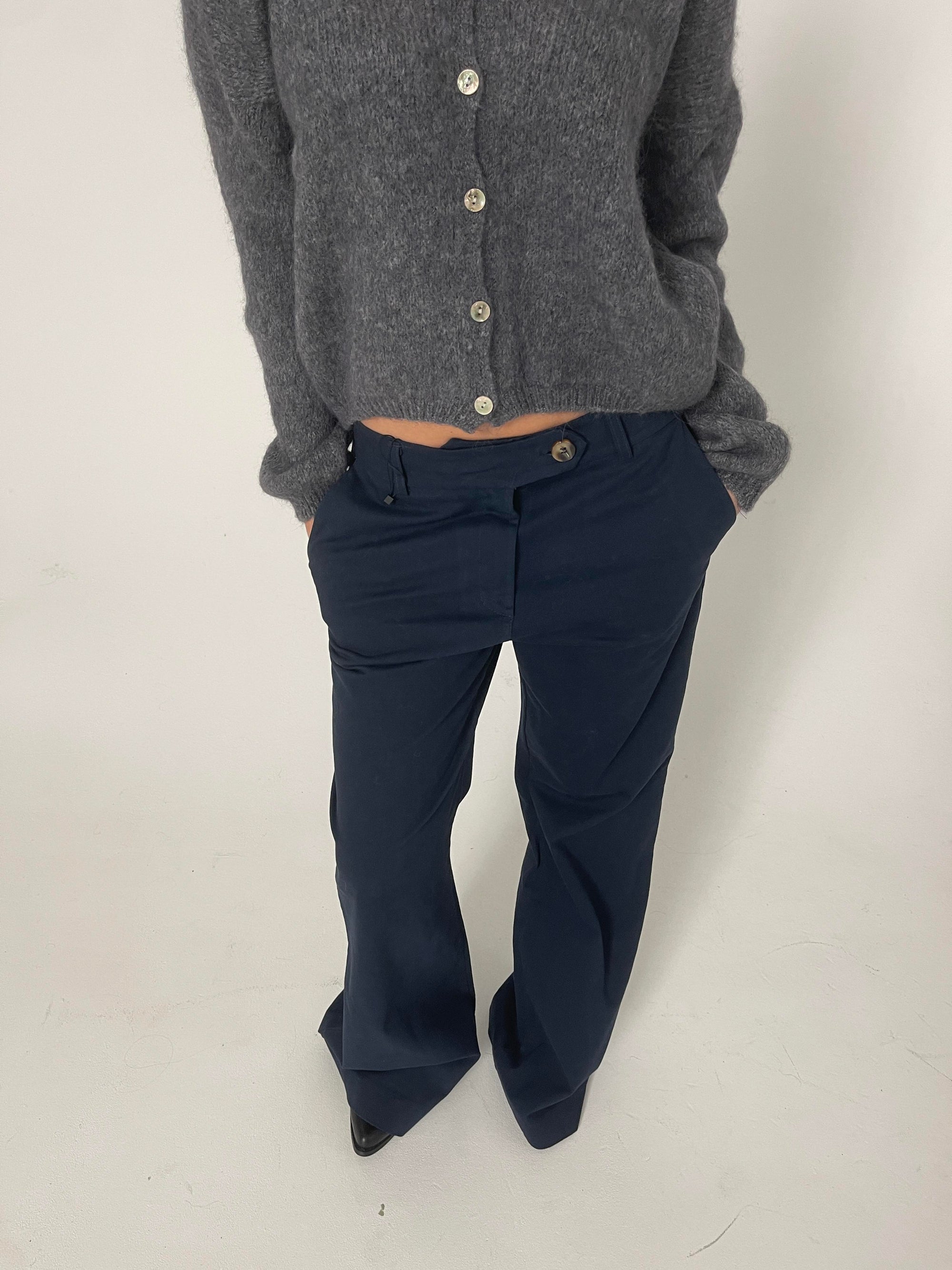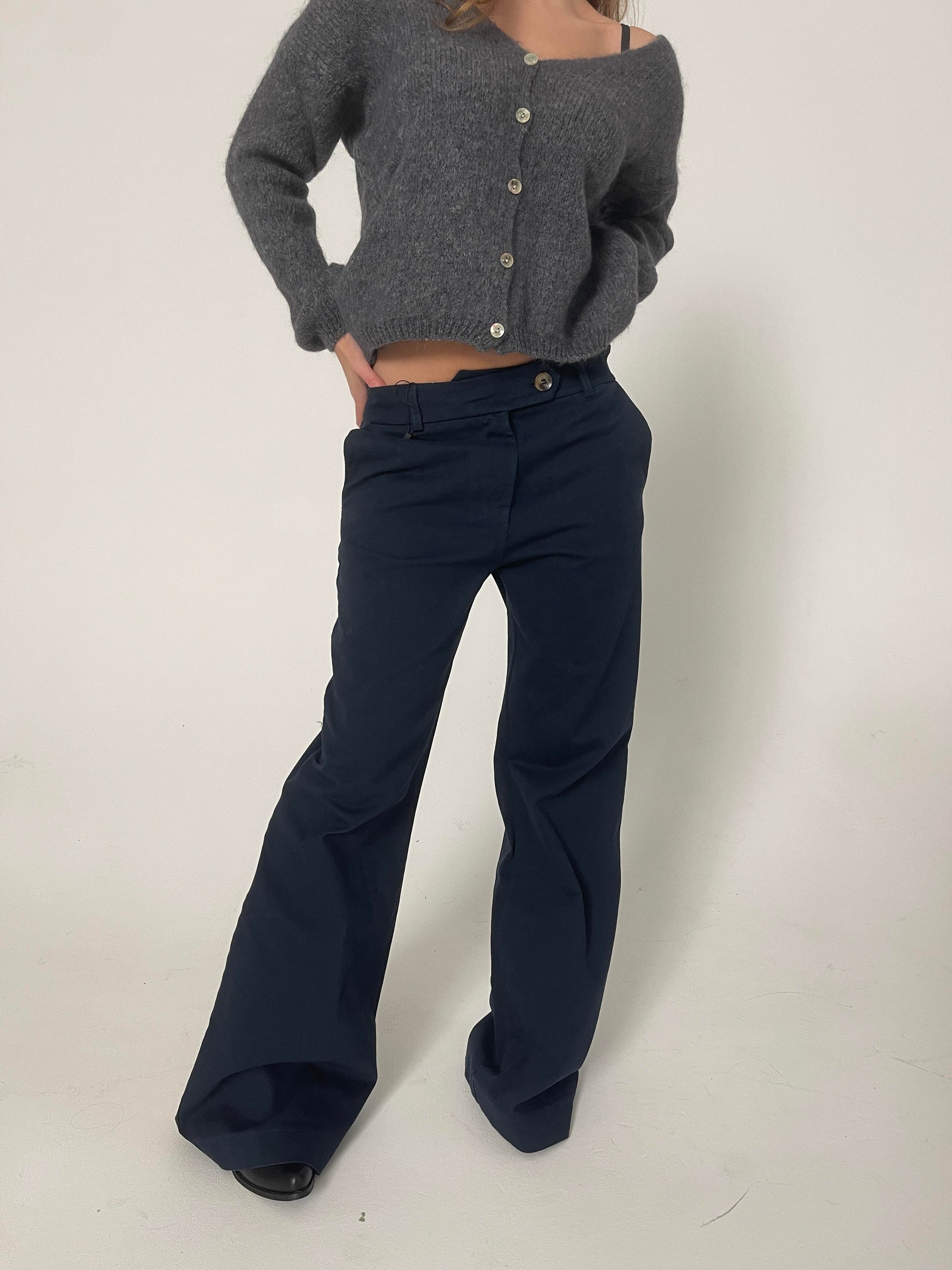 Disse bukser har et løst og afslappet udseende og er designet med brede ben. Bukserne lukkes med knap og lynlås foran. De består af bæltestropper, 2 lommer på siderne og har 2 dekorative lommer bagpå.