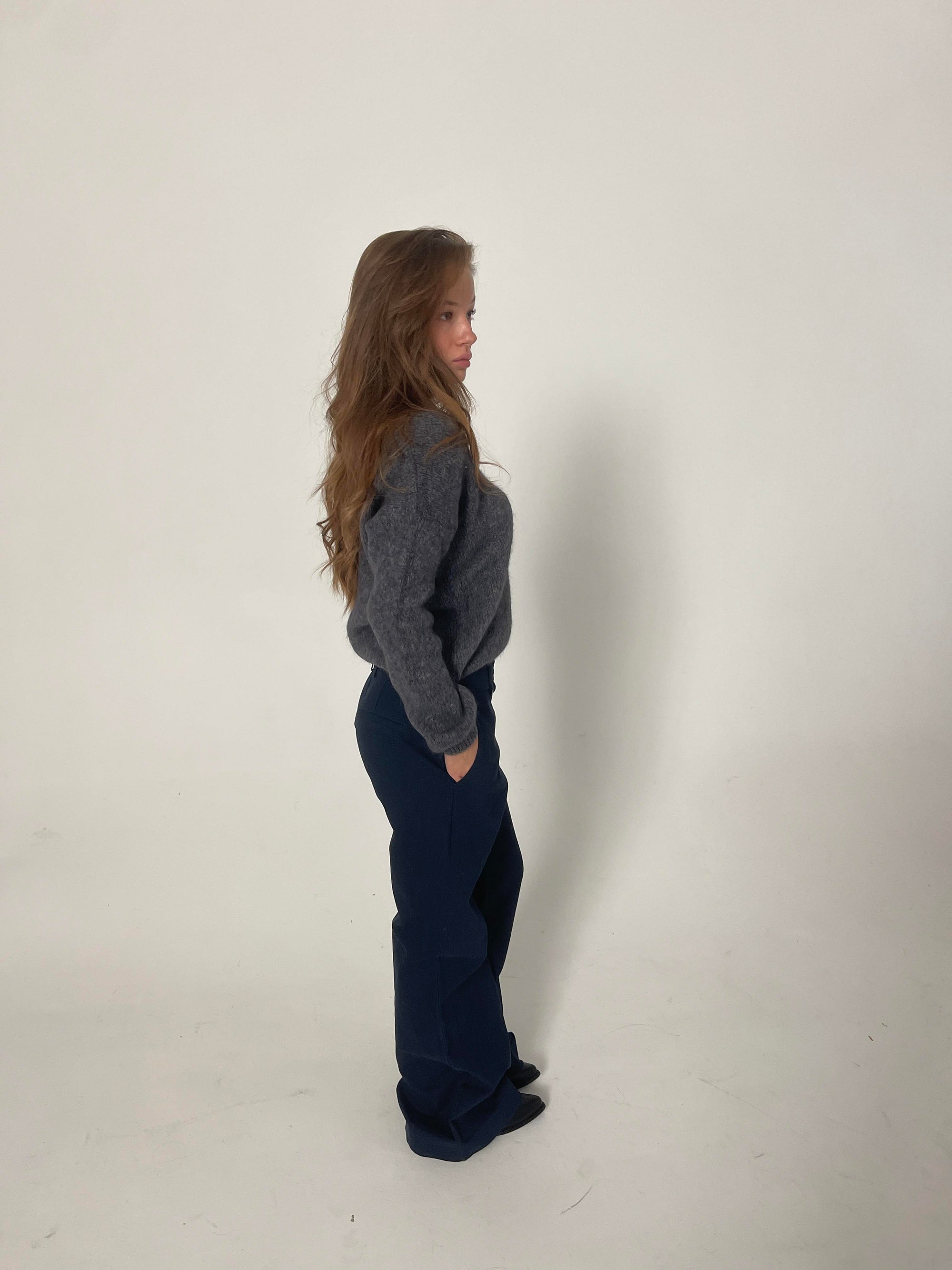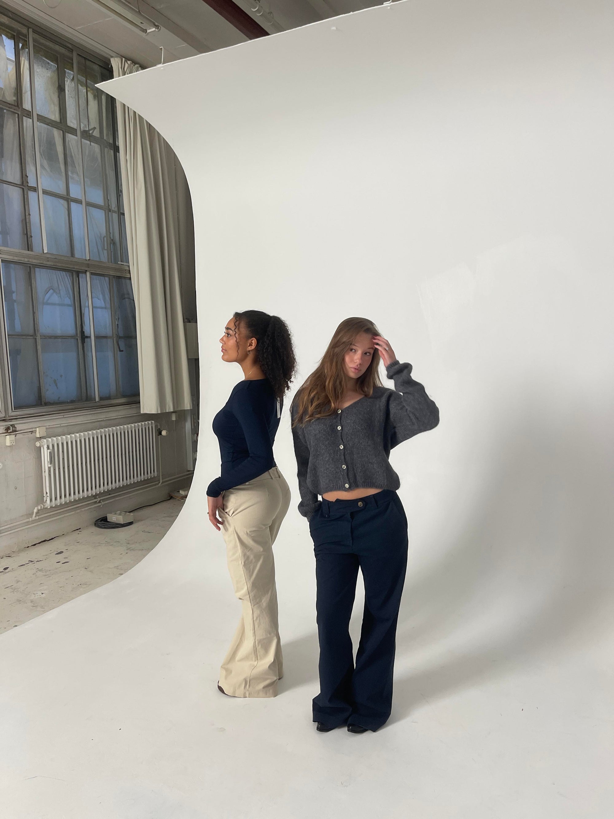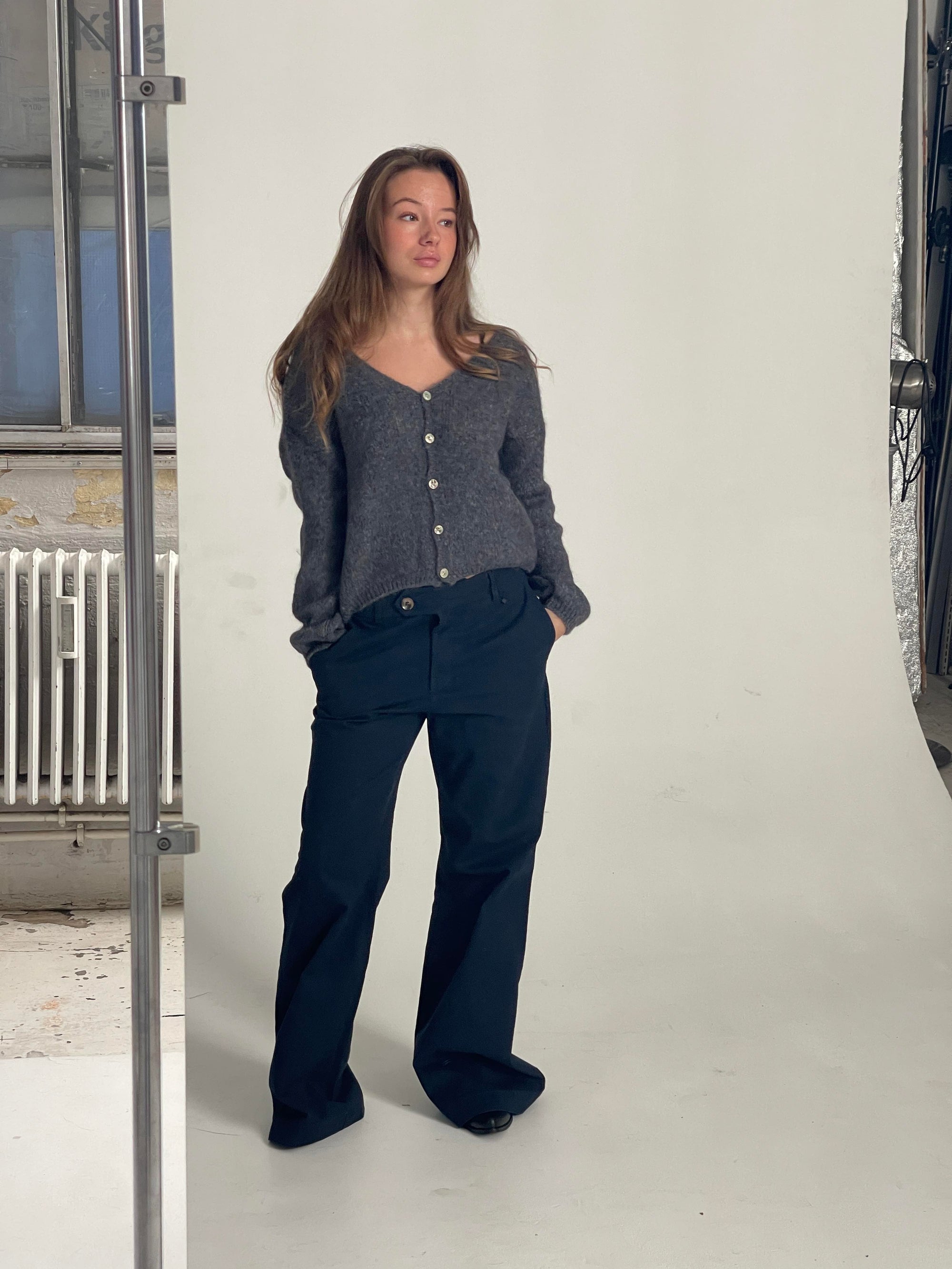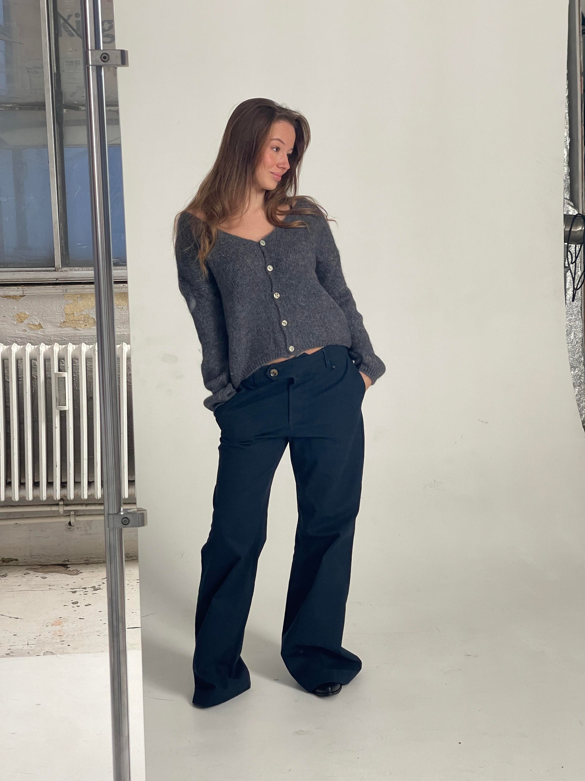 Disse bukser har et løst og afslappet udseende og er designet med brede ben. Bukserne lukkes med knap og lynlås foran. De består af bæltestropper, 2 lommer på siderne og har 2 dekorative lommer bagpå.