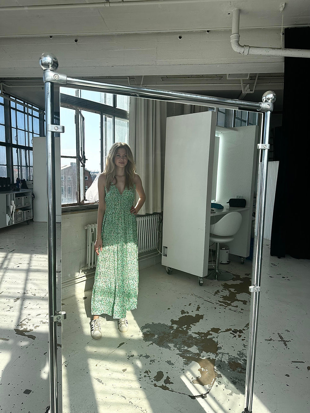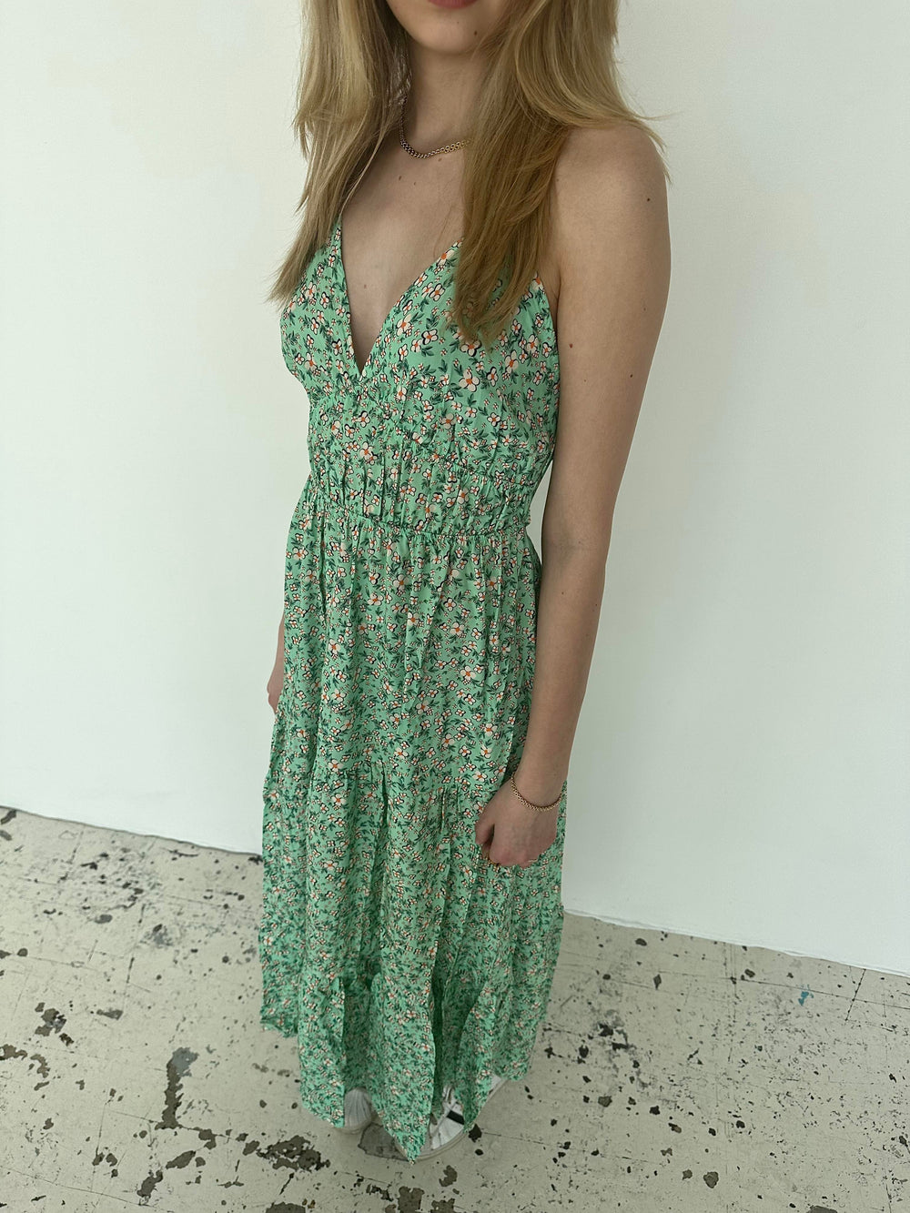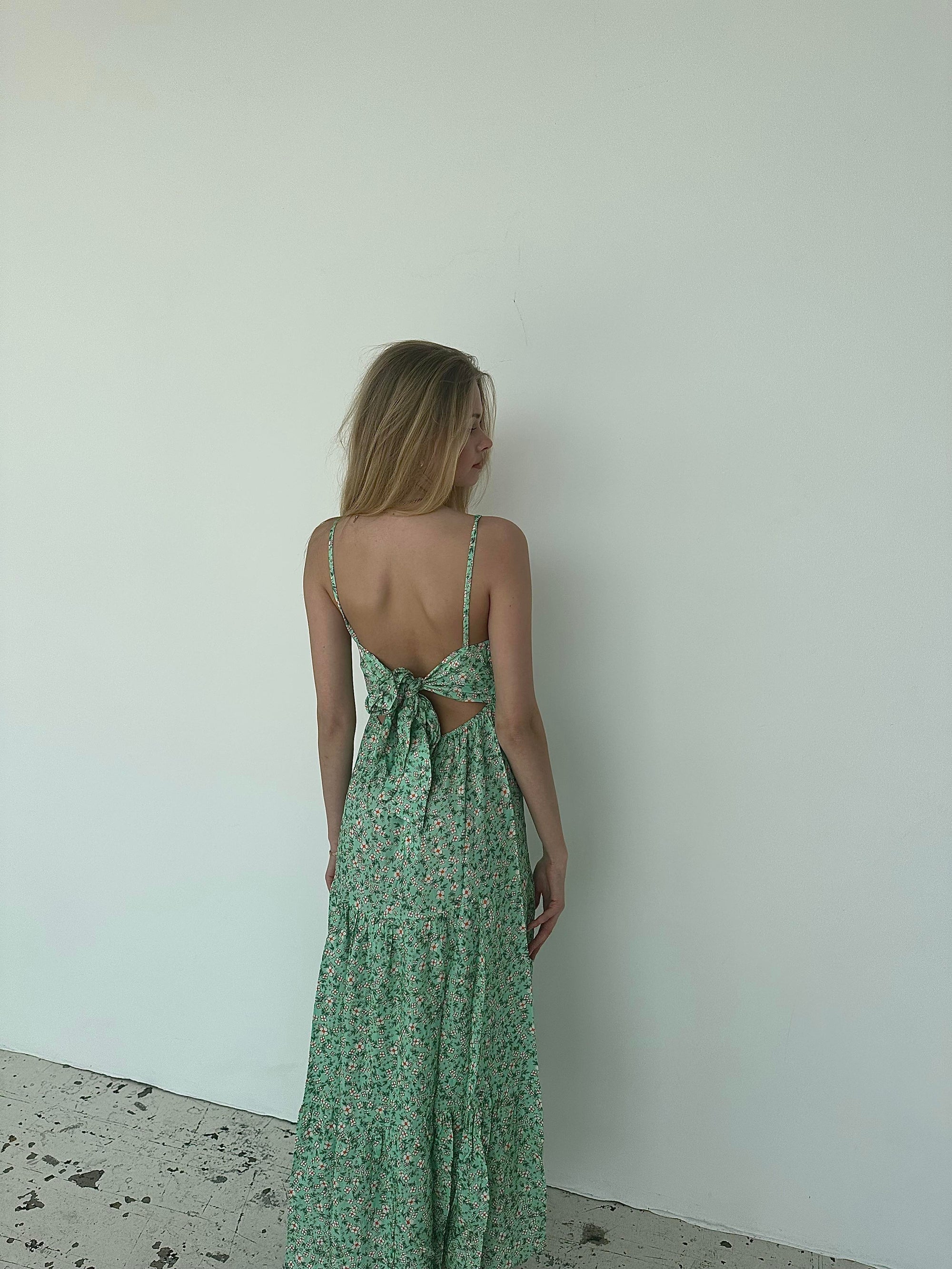 Fin lang sommerkjole med v-udskæring og fine detaljer. Kjolen har tynde stropper, og den bindes på ryggen.