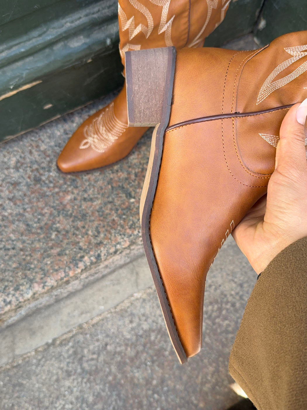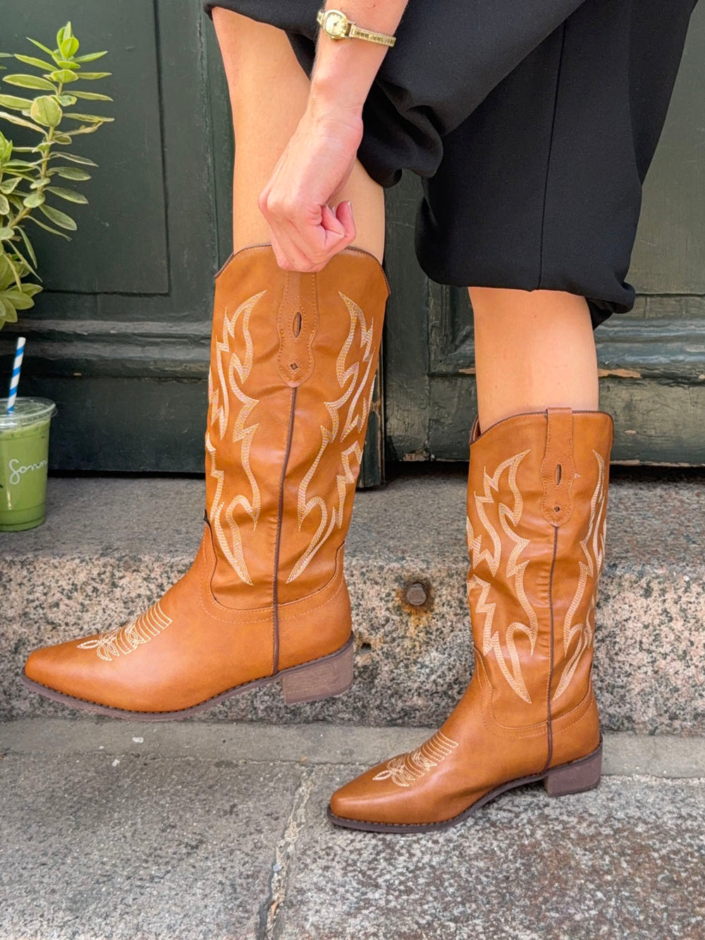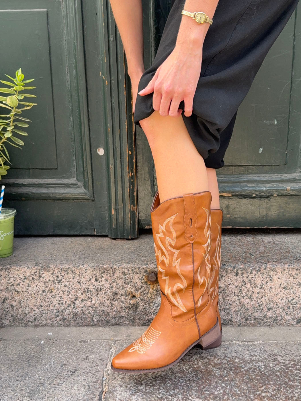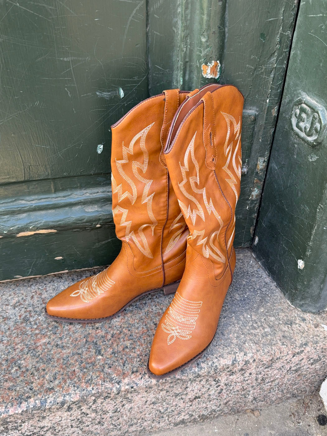 Klassiske cowboystøvler i blødt imiteret læder med dekorative stikninger i kontrastfarve. Den varme brune tone og det tidløse western-design gør dem perfekte til både hverdag og festlige anledninger. Et par støvler der giver dit outfit kant og karakter.