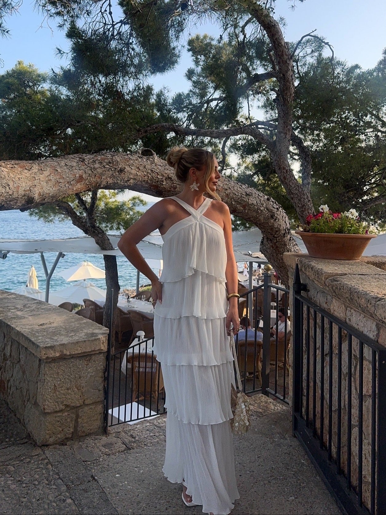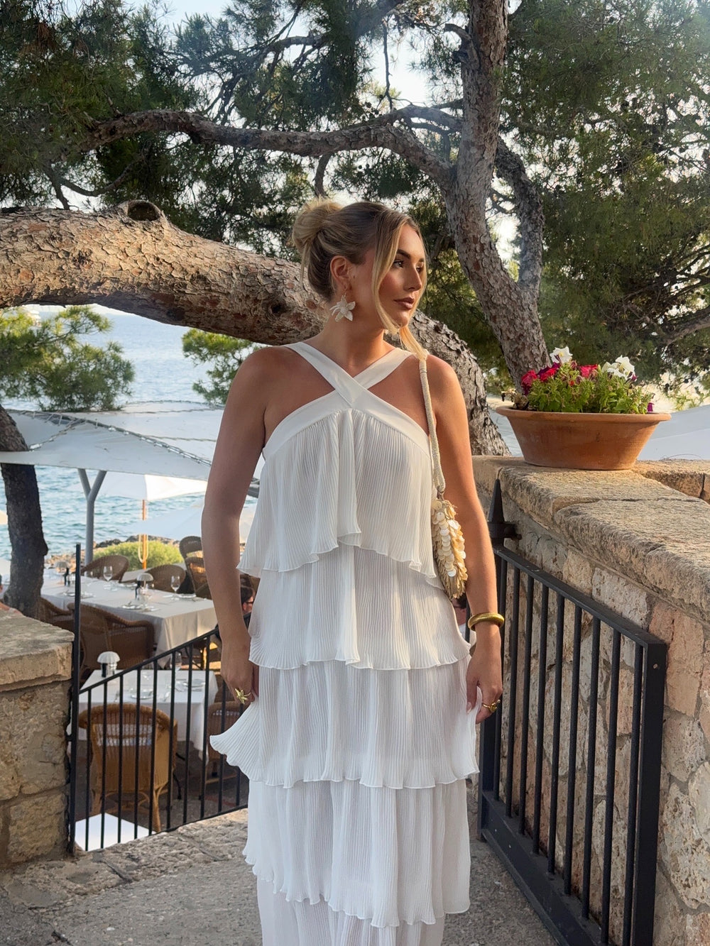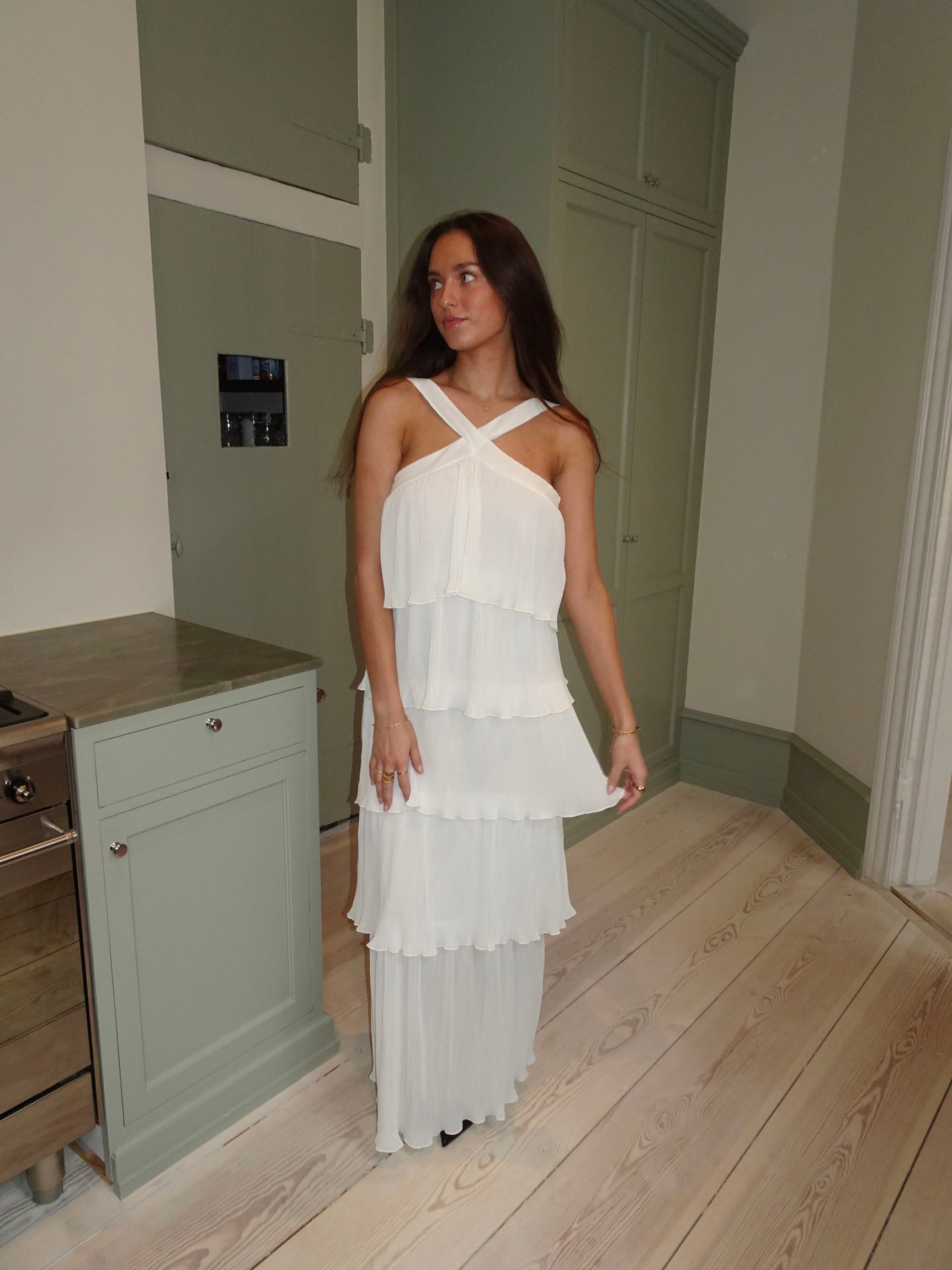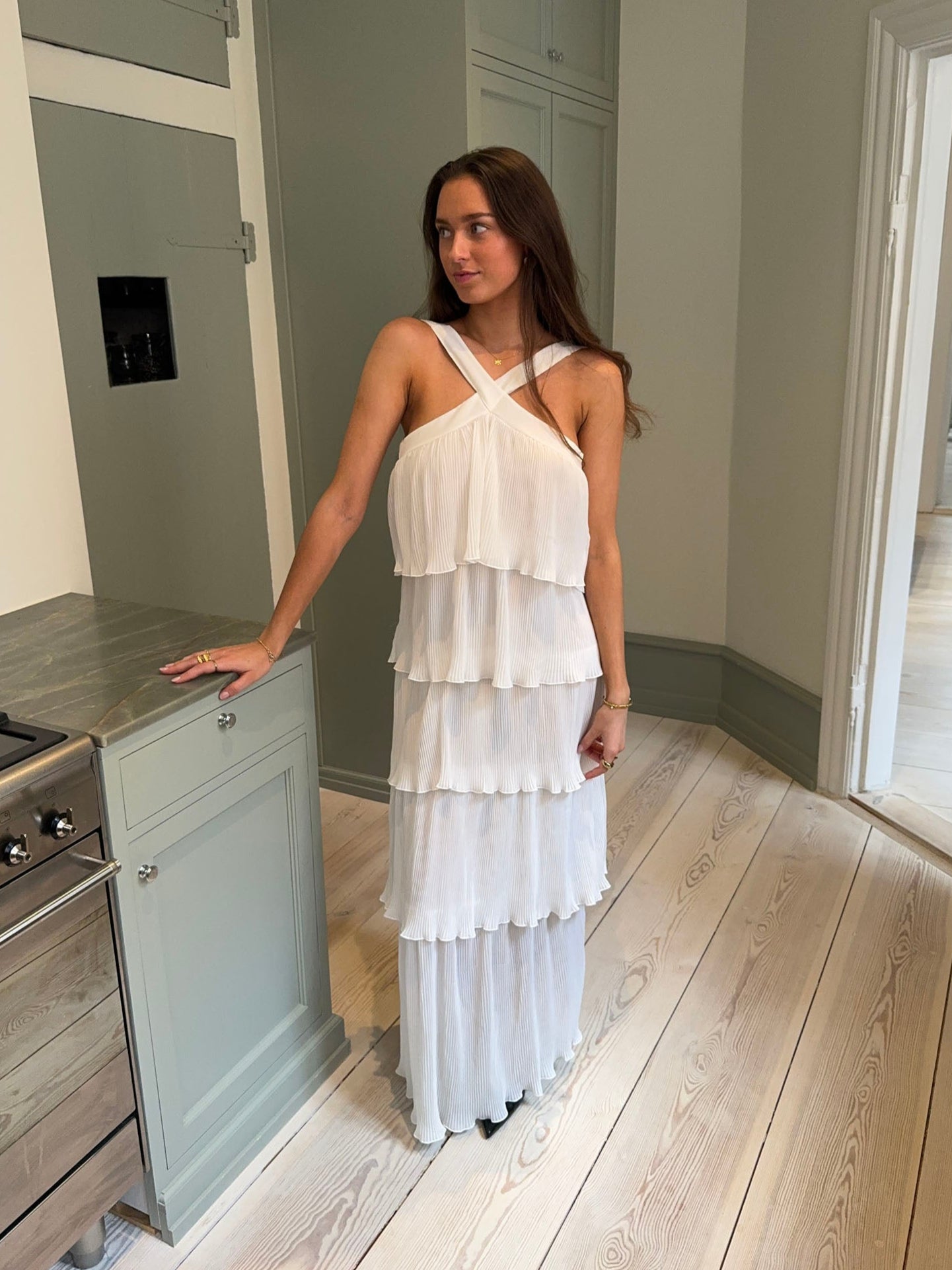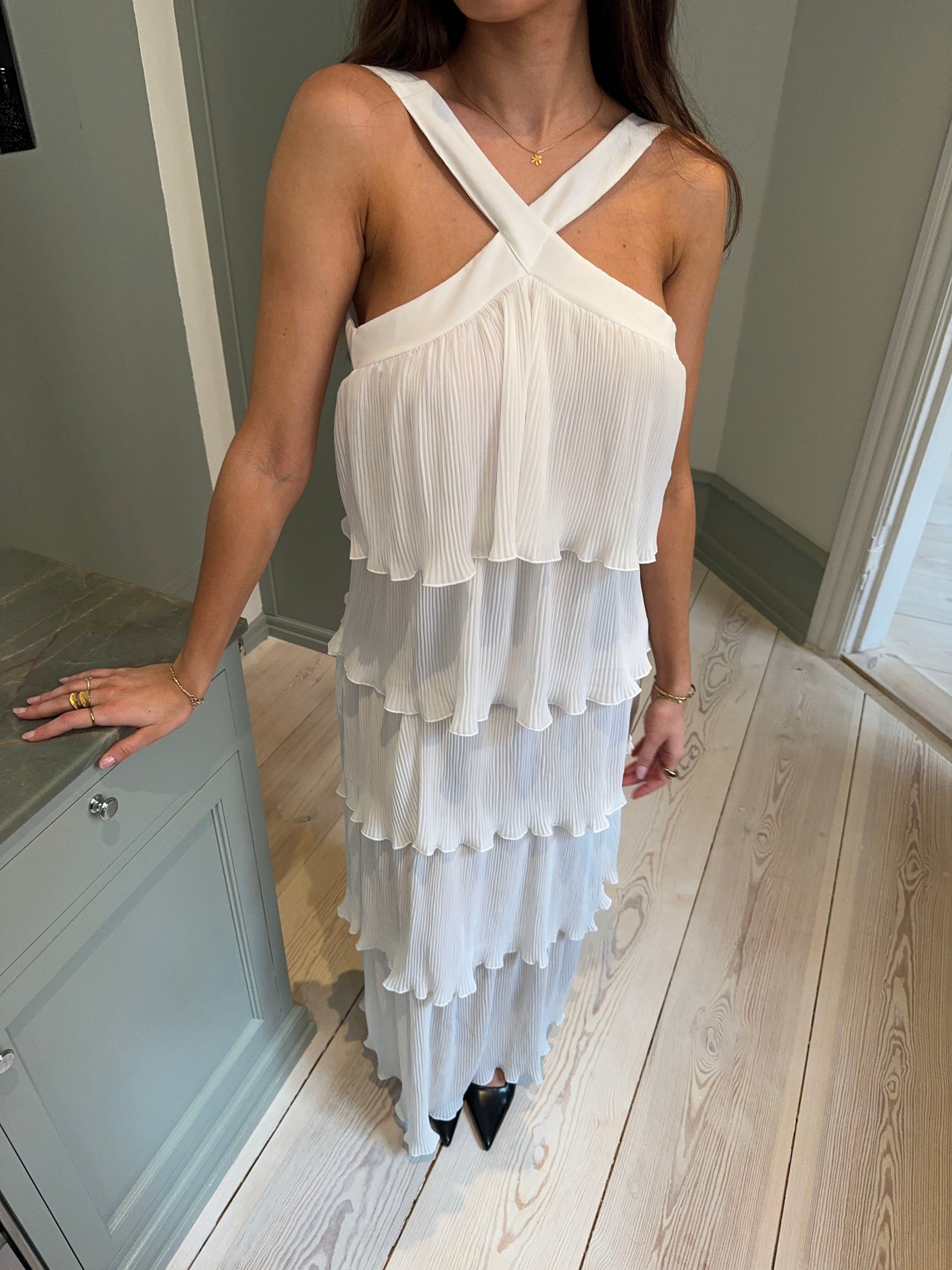 Denne lange hvide kjole med brede vandrette lag af flæser skaber et luftigt og dramatisk look. De lette frynser bevæger sig smukt med hver bevægelse og tilføjer en dynamisk elegance til kjolens design. Kjolen har en løstsiddende pasform, der giver både komfort og stil, og de brede stropper danner en smuk halterneck udskæring, som fremhæver skuldrene på en sofistikeret måde. Perfekt til både festlige anledninger og stilfulde aftener, denne kjole er både iøjnefaldende og tidløs.