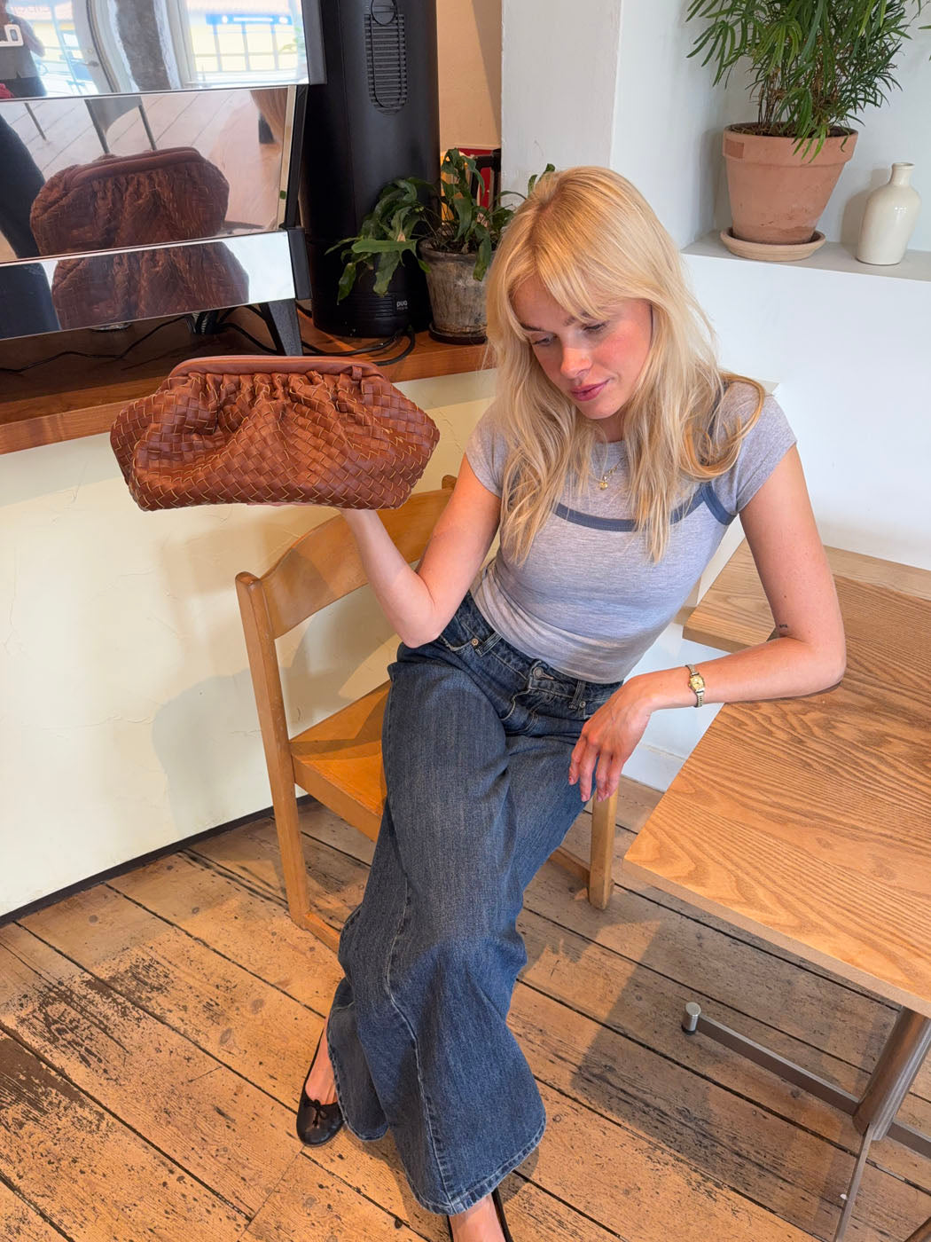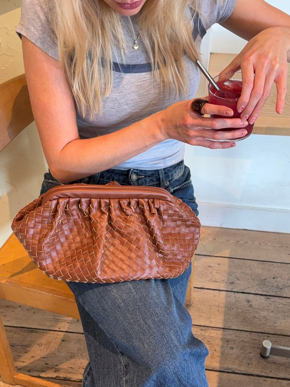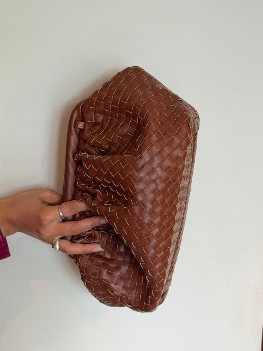 Felix er en kompakt og elegant håndtaske i flettet læderlook, der forener klassisk håndværk med moderne minimalisme. Den varme brune tone giver et tidløst udtryk, mens de diskrete sølvdetaljer tilfører et strejf af raffinement. Perfekt til både hverdagsbrug og særlige anledninger.