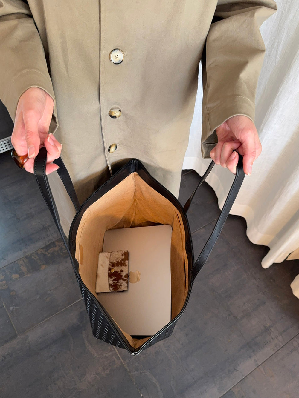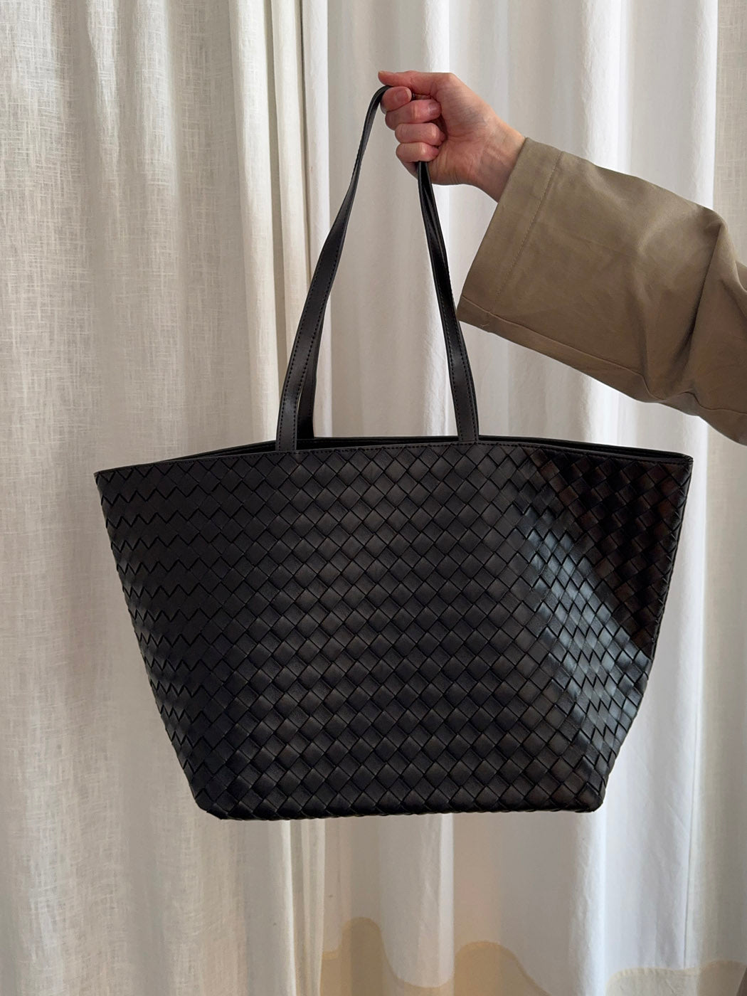 En rummelig og stilren taske i et klassisk flettet design. Den er ideel til både strandturen, shopping eller hverdagsbrug – med god plads til alt det nødvendige, inklusiv en computer. Tasken bæres komfortabelt over skulderen takket være de lange hanke.