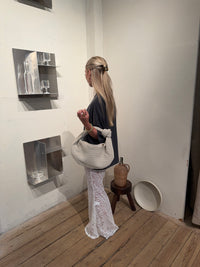 Vores Florence skuldertaske i en ny ruskindsudgave. Tasken har en rund form og et vævet/flettet design med knude detalje. Tasken har et stort hovedrum med lynlåslukning, og et mindre rum med lynlås inde i tasken. Perfekt til en bytur, eller hverdagen.