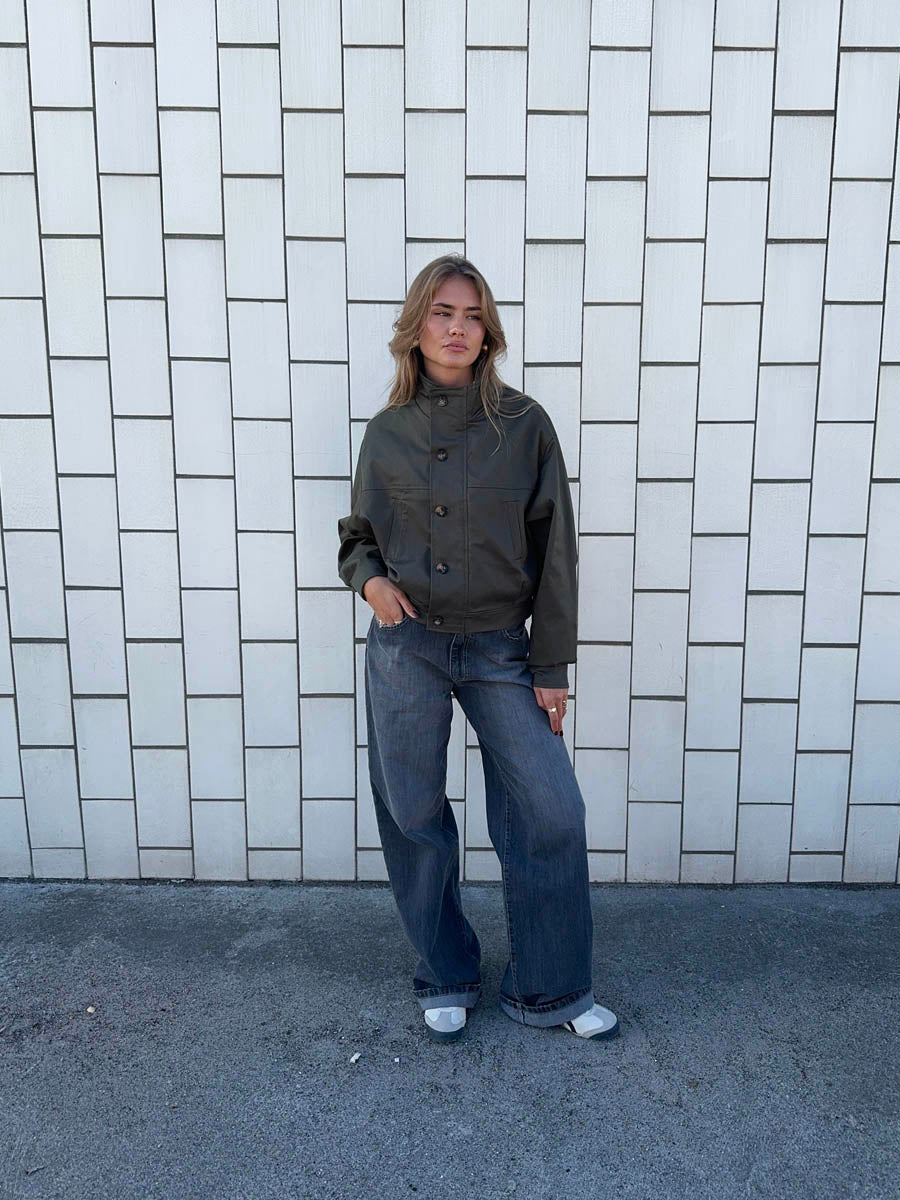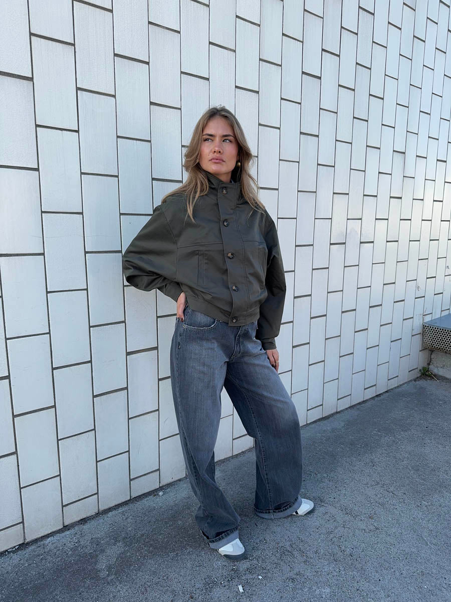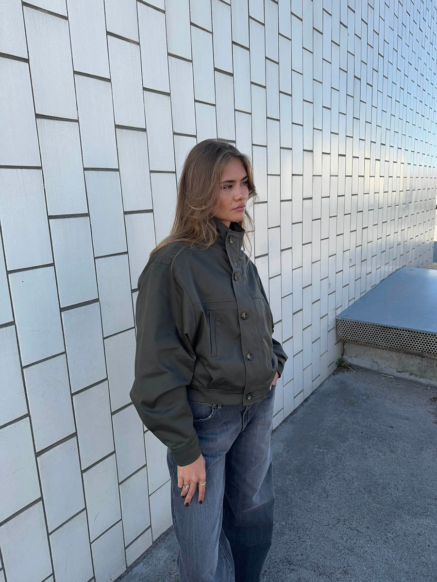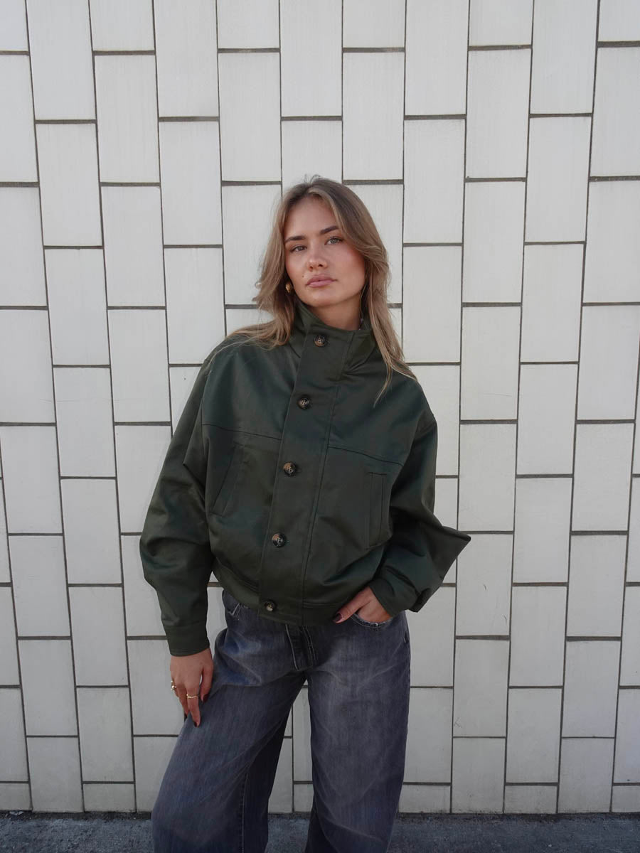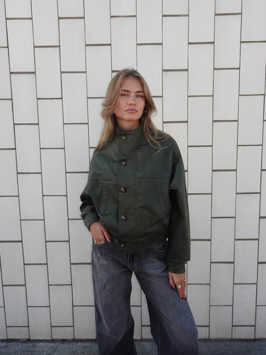 Opnå et cool og afslappet look med denne stilrene jakke i en smuk armygrøn nuance. Jakken har en oversize pasform, der giver et moderne og casual udtryk, perfekt til lag-på-lag styling. Det høje halsdesign og de store knapper tilfører kant og karakter, mens de brede manchetter med knaplukning fuldender det gennemførte look.