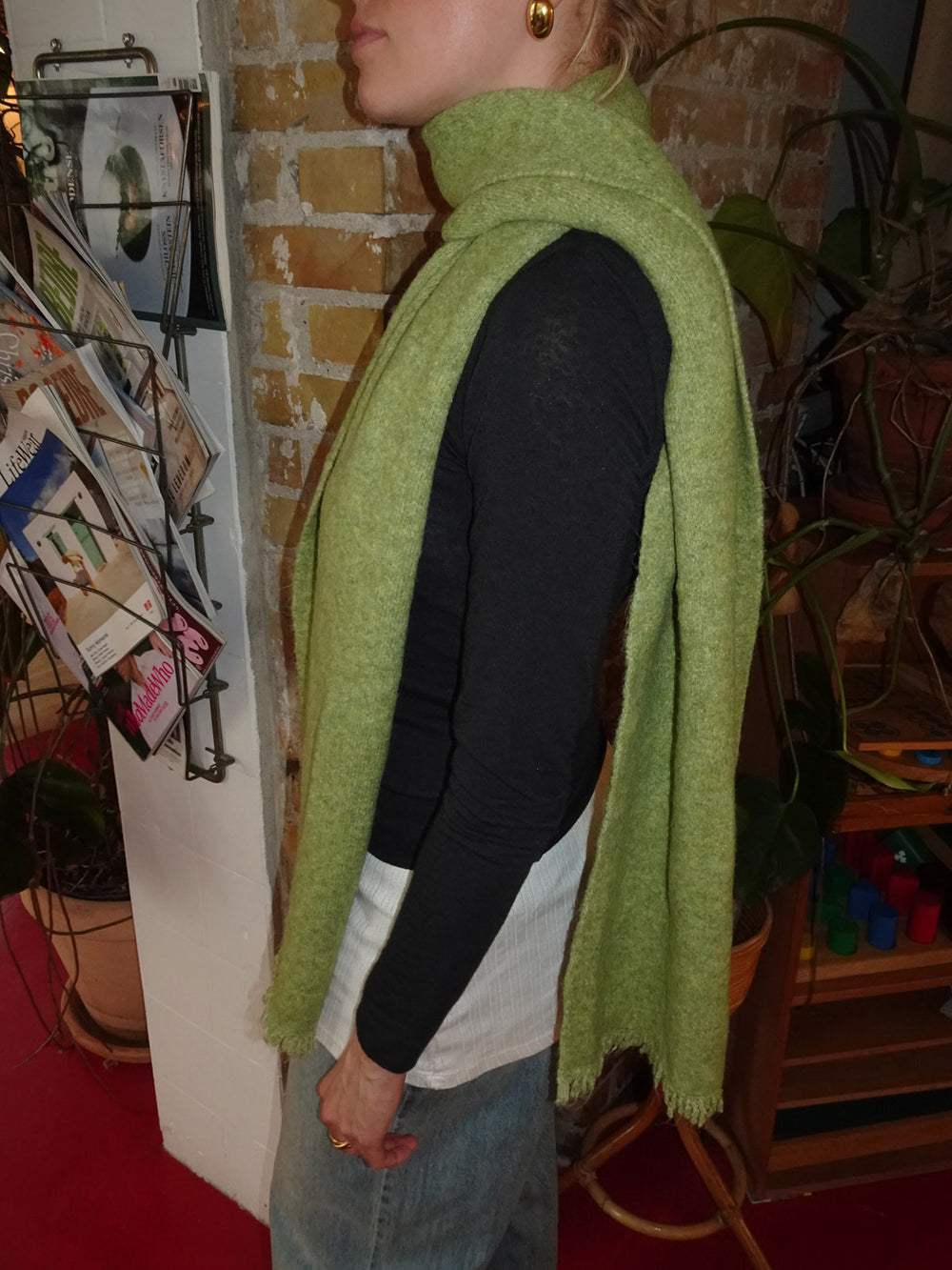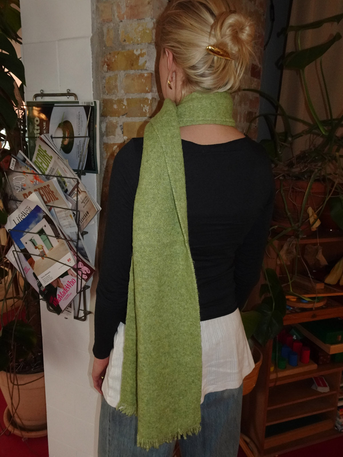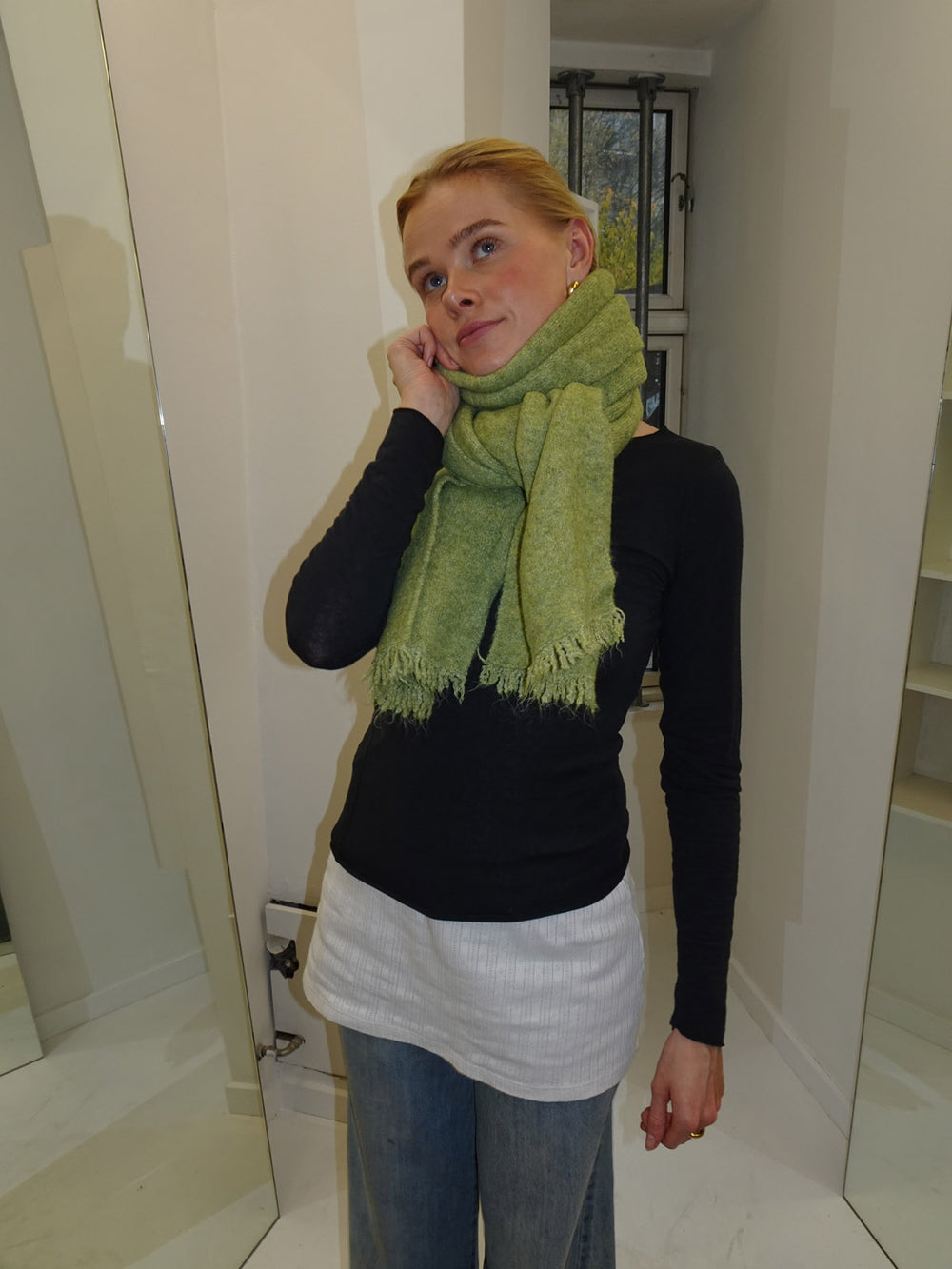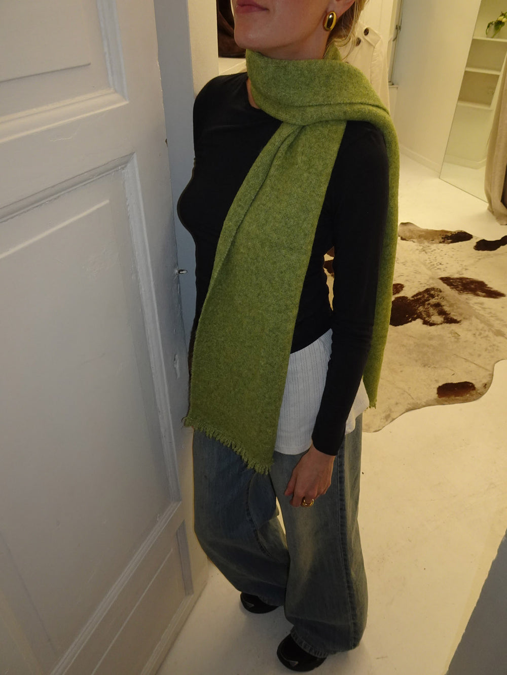 Tilføj et strejf af farve og varme til dit outfit med dette bløde, mosgrønne tørklæde. Fremstillet i 100% uld, der føles behagelig mod huden og holder dig varm på kølige dage. Den let flossede tekstur og rå frynsekant giver et afslappet, men sofistikeret udtryk.