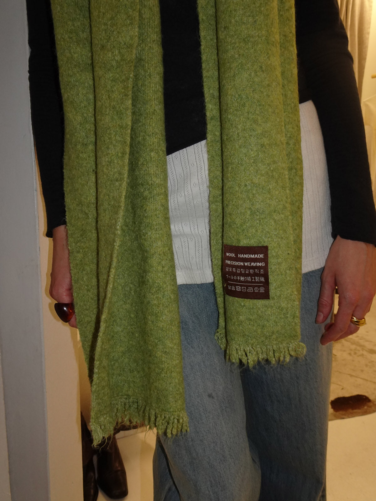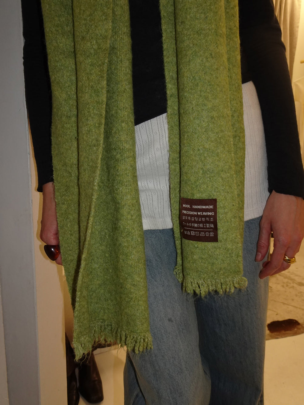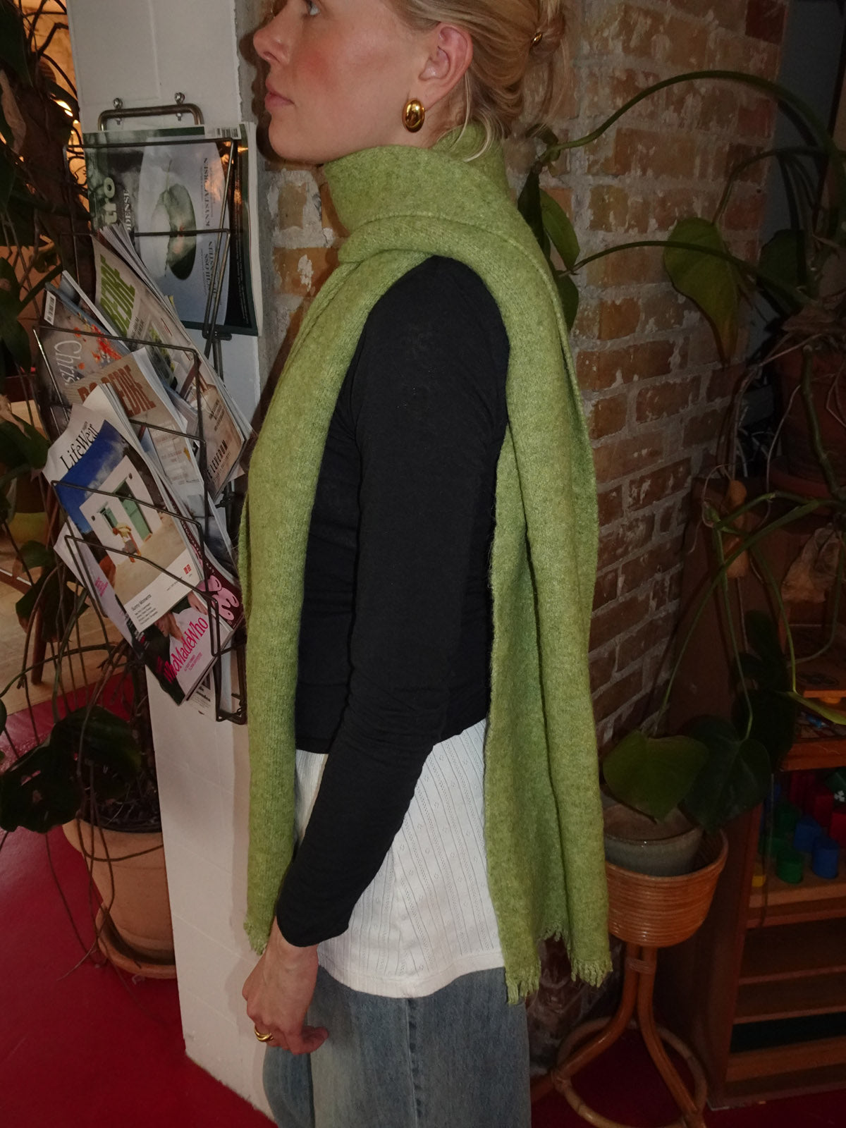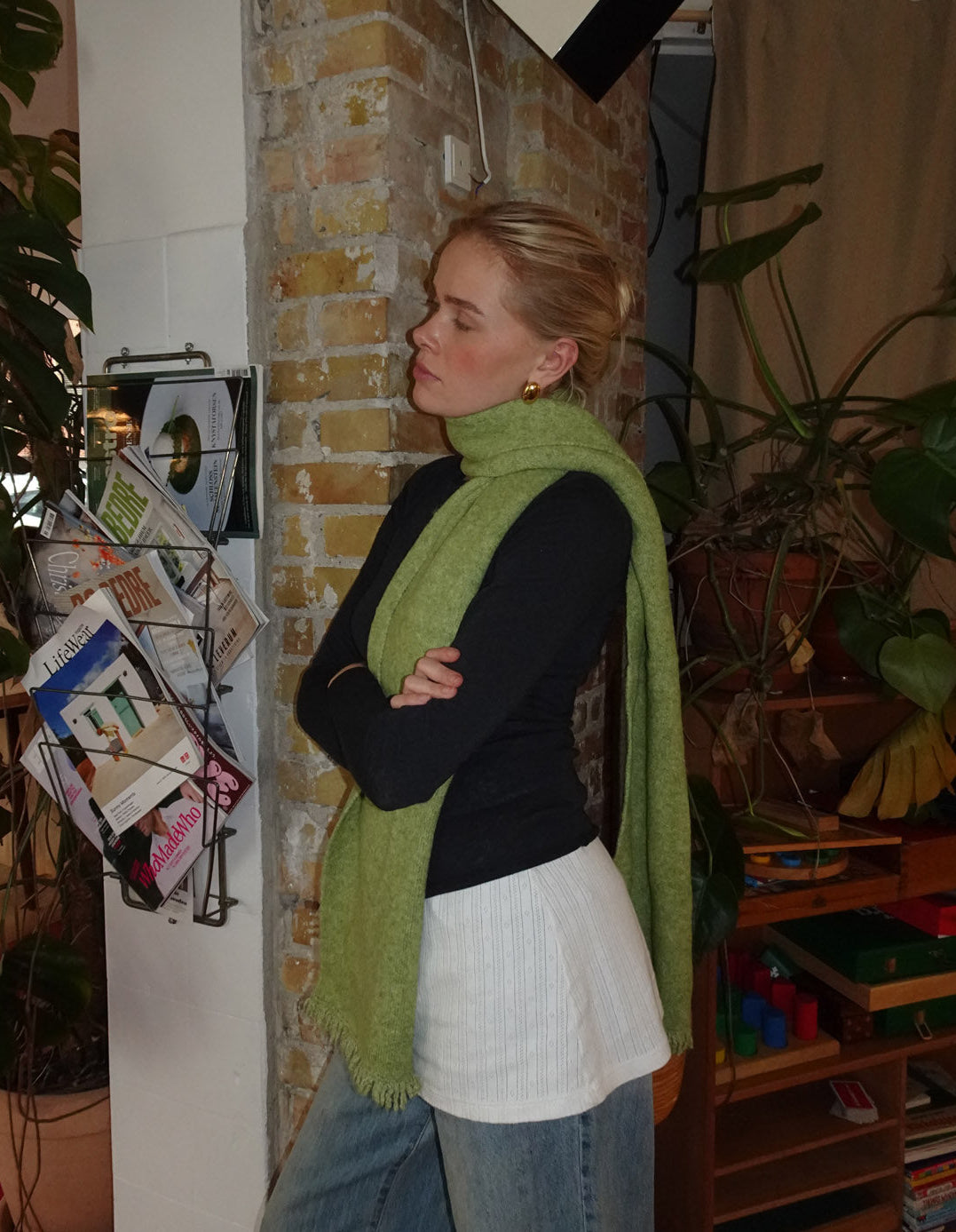 Tilføj et strejf af farve og varme til dit outfit med dette bløde, mosgrønne tørklæde. Fremstillet i 100% uld, der føles behagelig mod huden og holder dig varm på kølige dage. Den let flossede tekstur og rå frynsekant giver et afslappet, men sofistikeret udtryk.