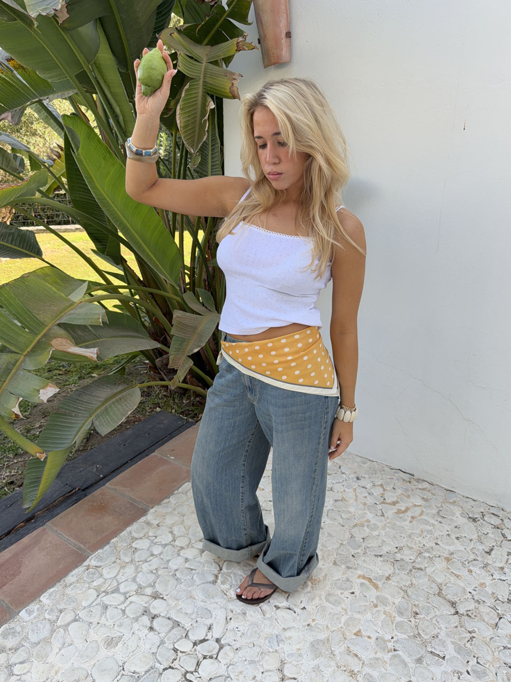 Dette gule tørklæde med hvide prikker emmer af klassisk elegance og feminin charme. Den lette, glatte kvalitet falder smukt og gør tørklædet behageligt at bære året rundt.