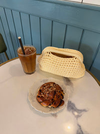 Calia er en charmerende hæklet clutch. Den brune nuance giver et klassisk udtryk, mens det kompakte design gør den perfekt til både afslappede dage og festlige aftener. En unik accessory med naturlig varme og personlighed.