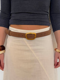 Dette er et stilfuldt og moderne taljebælte fremstillet af imiteret læder. Det har et slankt, minimalistisk design, der løftes af et karakteristisk ovalt spænde i en banket guld tone. Spændet tilføjer et farverigt element og et diskret retro-touch til det samlede look. Perfekt til at kombinere med neutrale eller jordfarvede outfits, forener dette bælte funktionalitet med et moderne udtryk og er ideelt til både afslappede og elegante looks.
