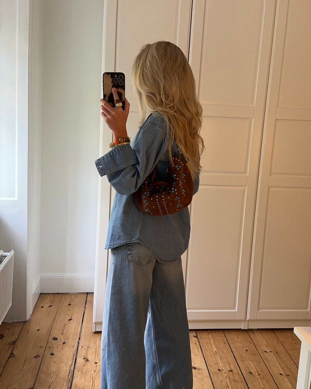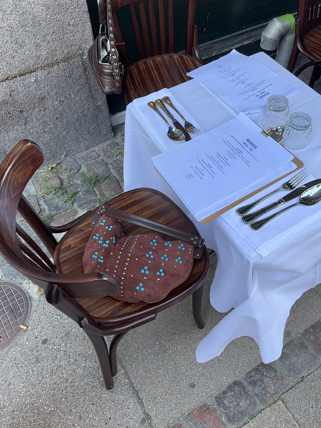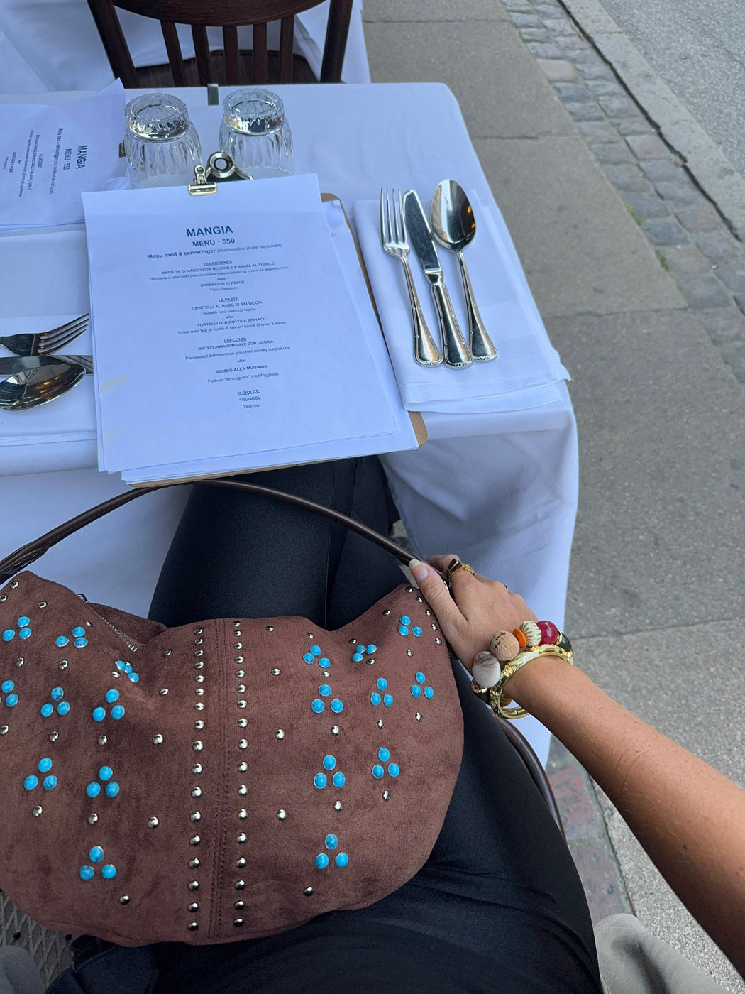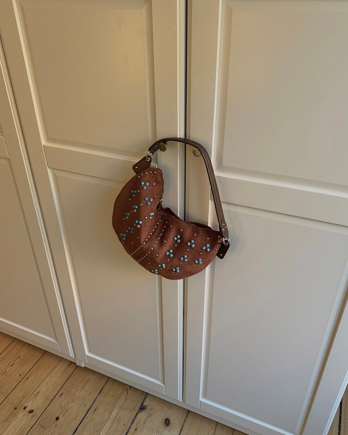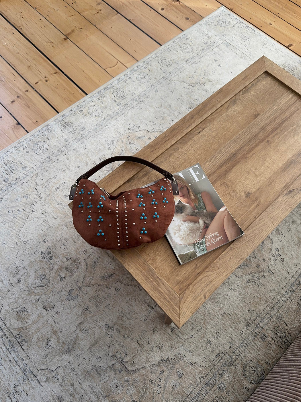 En unik håndtaske med et bohemepræget udtryk, fremstillet i blødt brunt ruskind. Tasken er udsmykket med sølvnitter og turkisblå sten i et symmetrisk mønster, der giver en autentisk og iøjnefaldende charme. Perfekt til at tilføje et kunstnerisk og personligt touch til dit outfit.