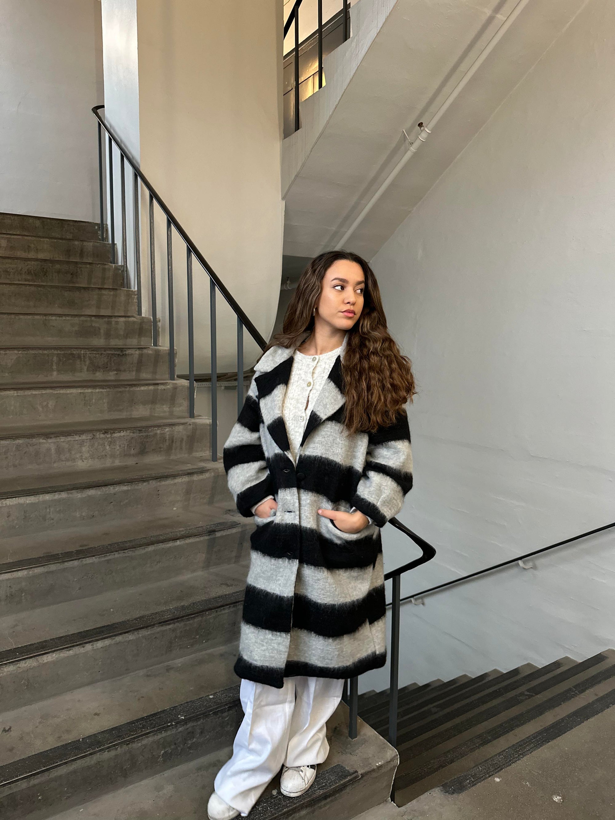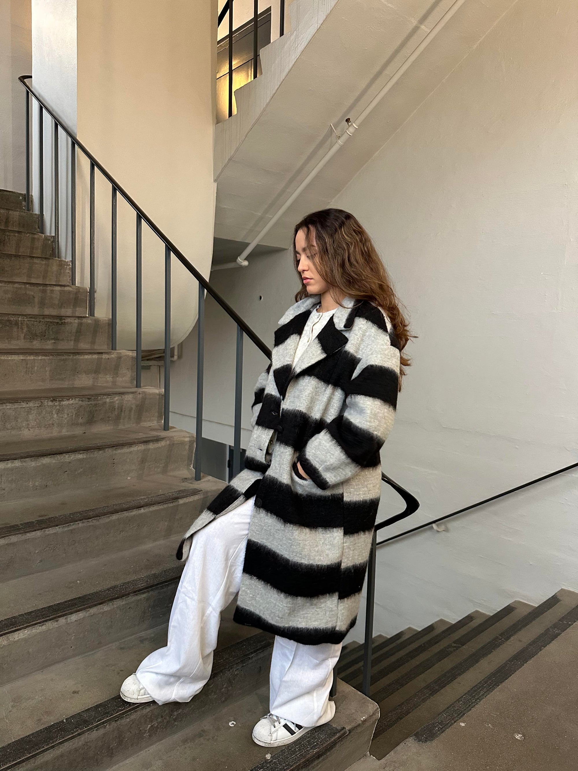 Oversized frakke med vandrette sorte striber. Frakke lukkes med knapper langs forsiden, og har to lommer. Den har brede reverser og en lang pasform.