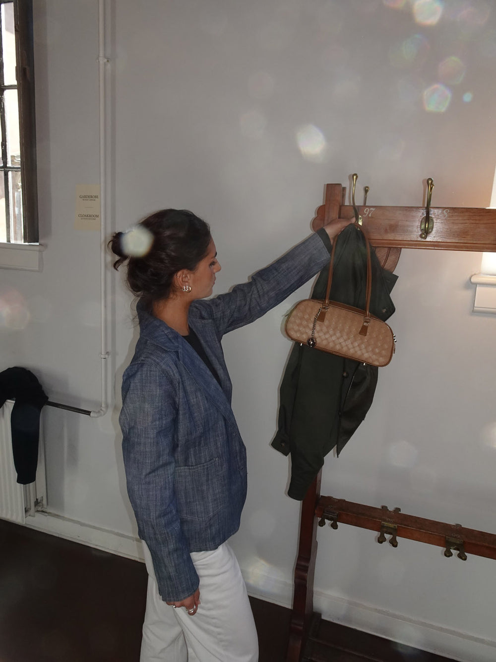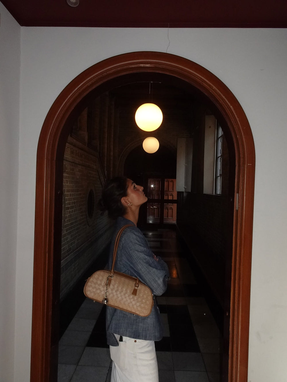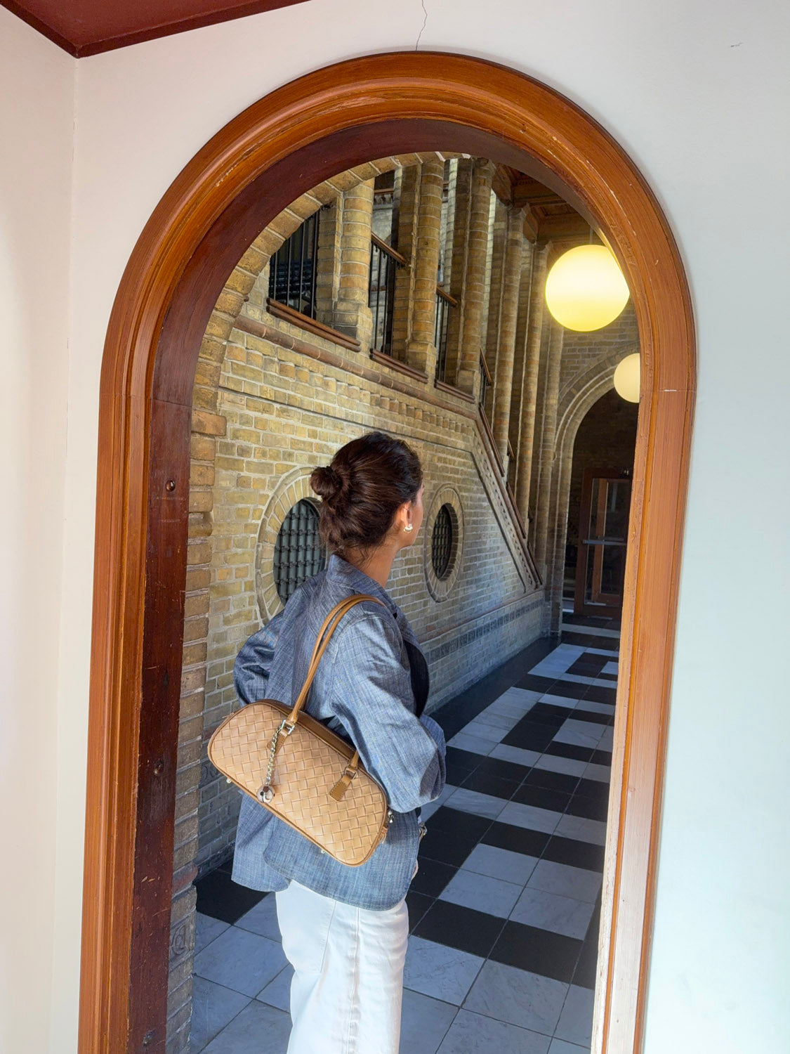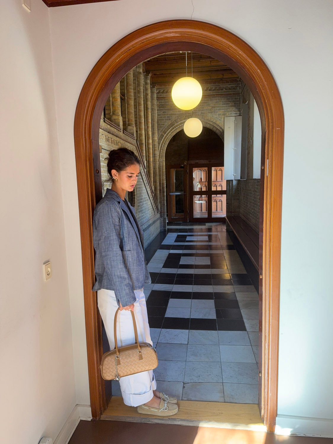 Noella er en elegant lille håndtaske i blødt beige materiale med klassisk fletmønster. Taskens fine struktur og enkle sølvdetaljer giver et tidløst, sofistikeret udtryk – perfekt som et diskret men stilfuldt accessory.
