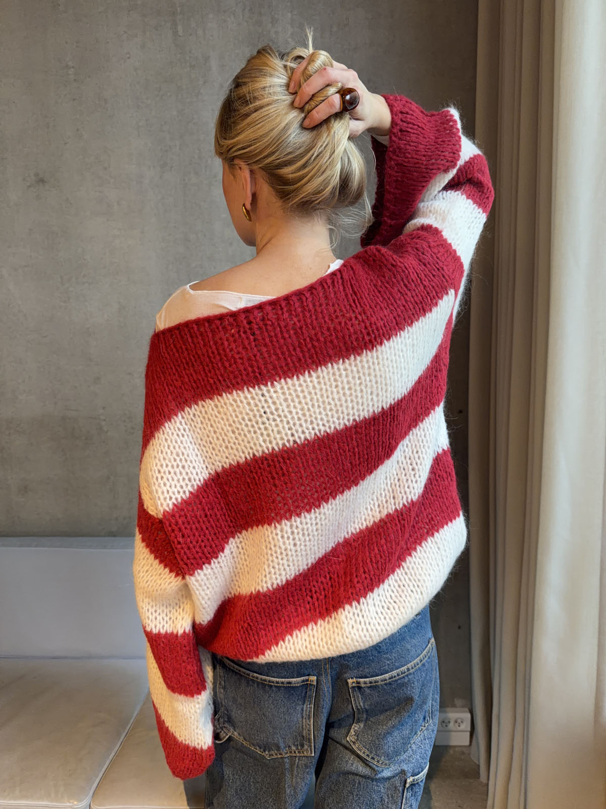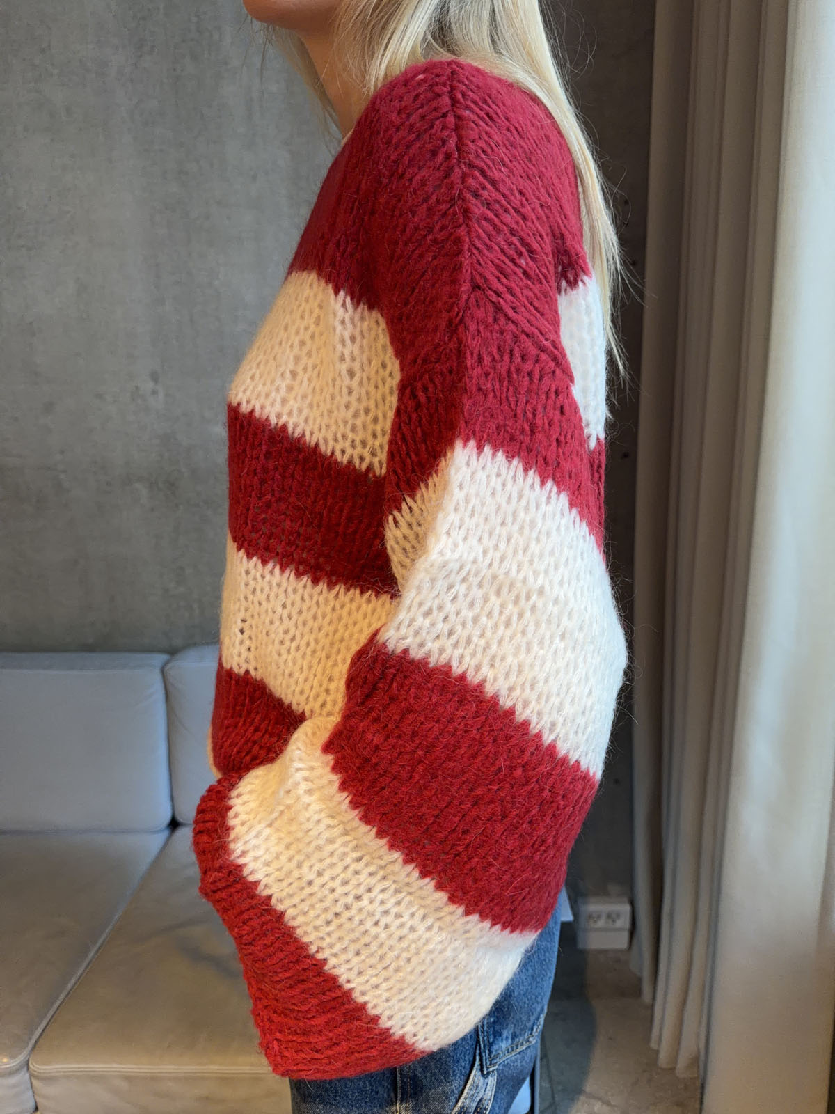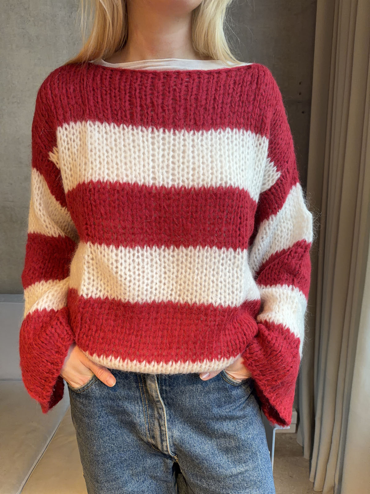 Denne striktrøje har et løst og oversized pasform og passer helt perfekt til alle årstider, da man både kan bruge den i de kolde vintermåneder samt en kold sommeraften. Striktrøjen består af lange brede ærmer og er designet med en bred rund halsudskæring.